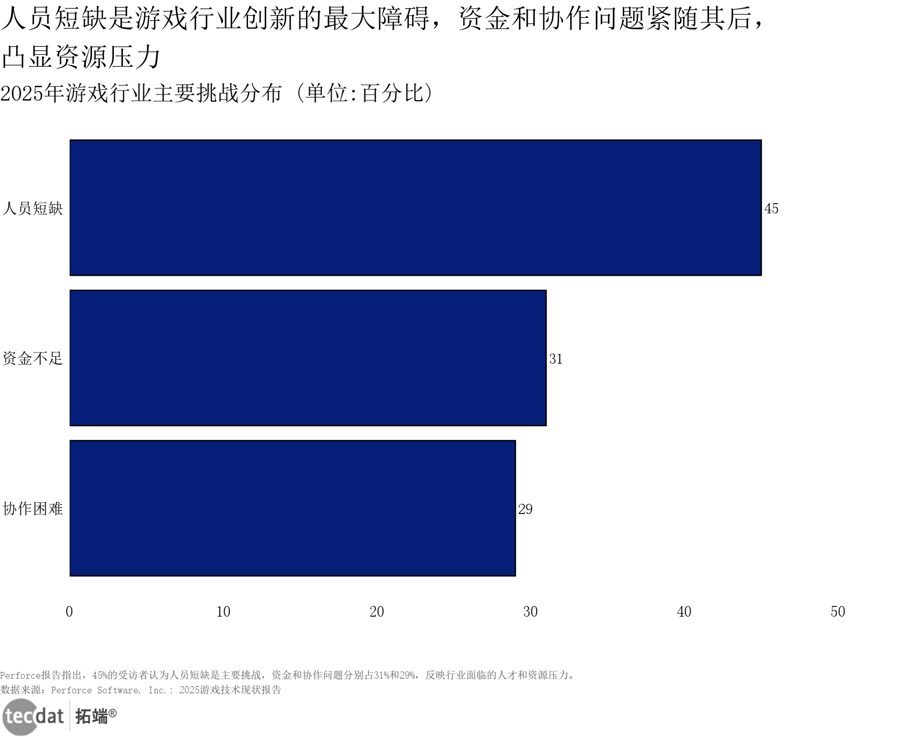 行业增长背后,挑战与机遇并存。人员短缺成为创新最大障碍(45%受访者提及),人才缺口制约行业创新;资金不足(31%)与协作困难(29%)紧随其后,成为中小团队的主要痛点。不同规模团队面临的难题各异:小型团队侧重提升协作效率,大型团队则面临时间紧迫与规模化管理的双重压力。
