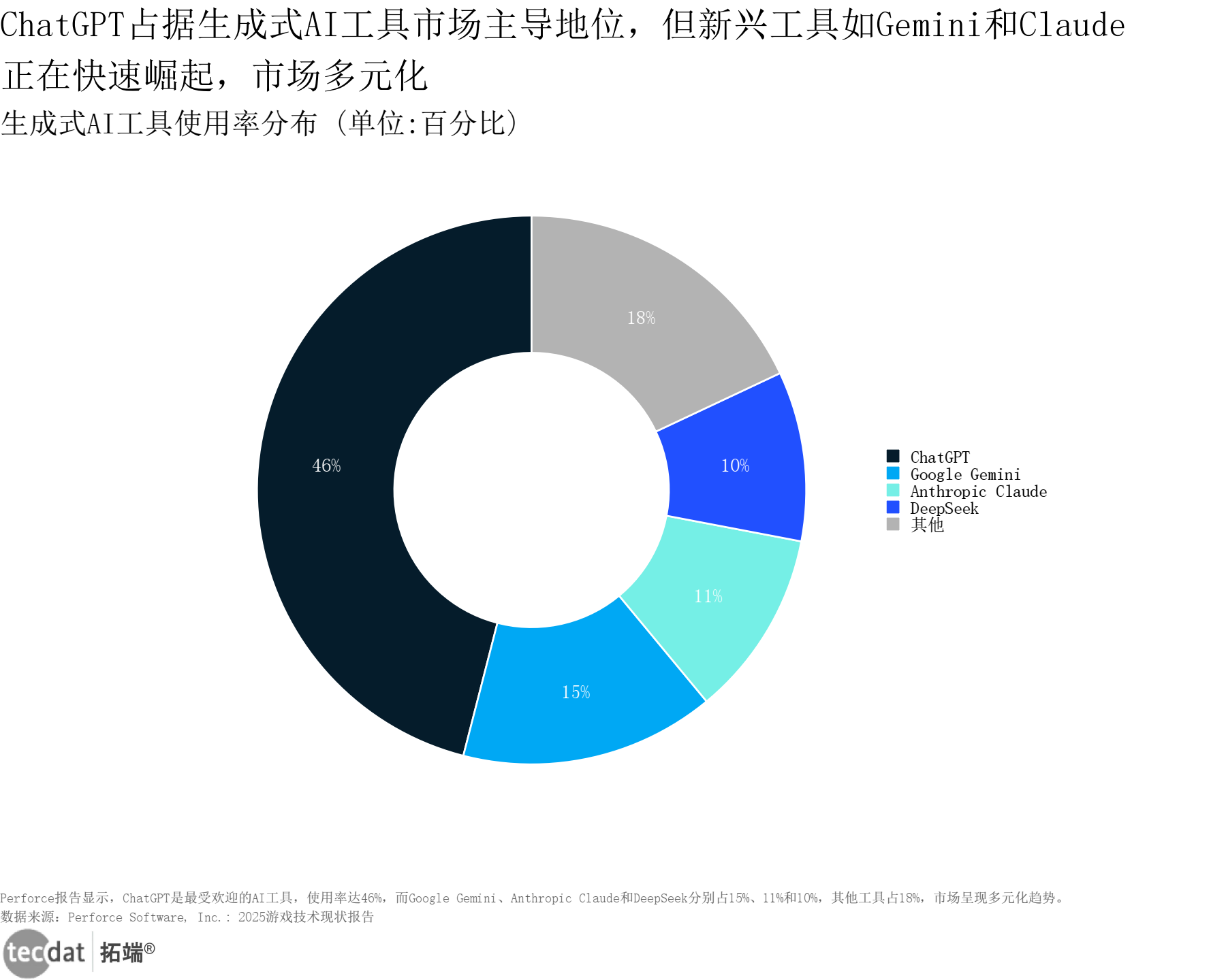 生成式AI已成为游戏行业的“效率革命引擎”,70%的受访者将其纳入工作流程,其中媒体与娱乐行业使用率高达86%,远超整体水平,成为AI应用的核心试验场。工具市场呈现“一超多强”格局,ChatGPT以46%的使用率领跑行业,Google Gemini(15%)、Anthropic Claude(11%)、DeepSeek(10%)快速崛起,差异化功能抢占细分场景。