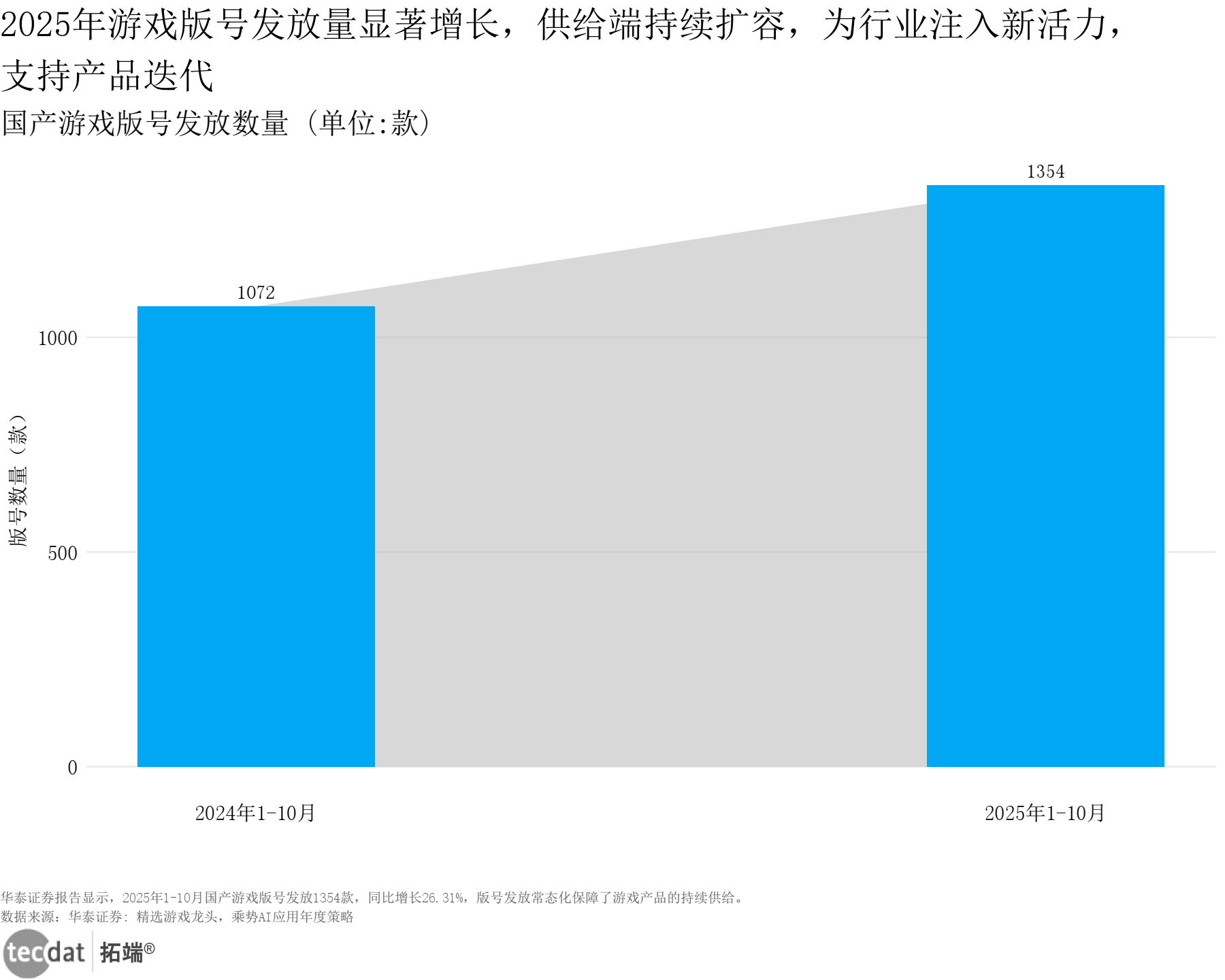 | 2025年1-10月国产游戏版号发放量 | 1354款 | 华泰研究《精选游戏龙头,乘势AI应用》 |