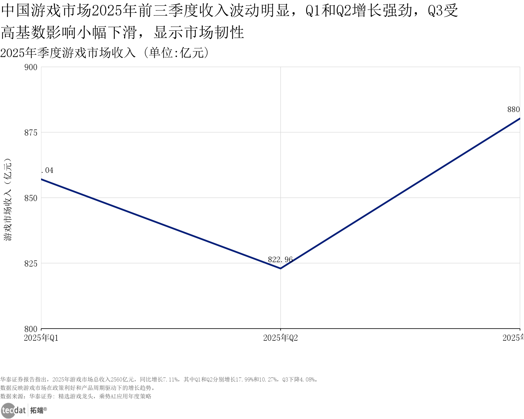 2025年游戏行业穿越周期压力,展现强劲增长韧性,前三季度总收入达2560亿元,同比增长7.11%。季度表现呈现”上半年领跑、三季度回调”的特征,Q1凭借春节档运营活动与新品放量,收入857.04亿元(同比+17.99%);Q2延续增长态势,收入822.96亿元(同比+10.27%);Q3受去年高基数影响,收入880.26亿元(同比-4.08%),但暑期档爆款已带动市场回暖。