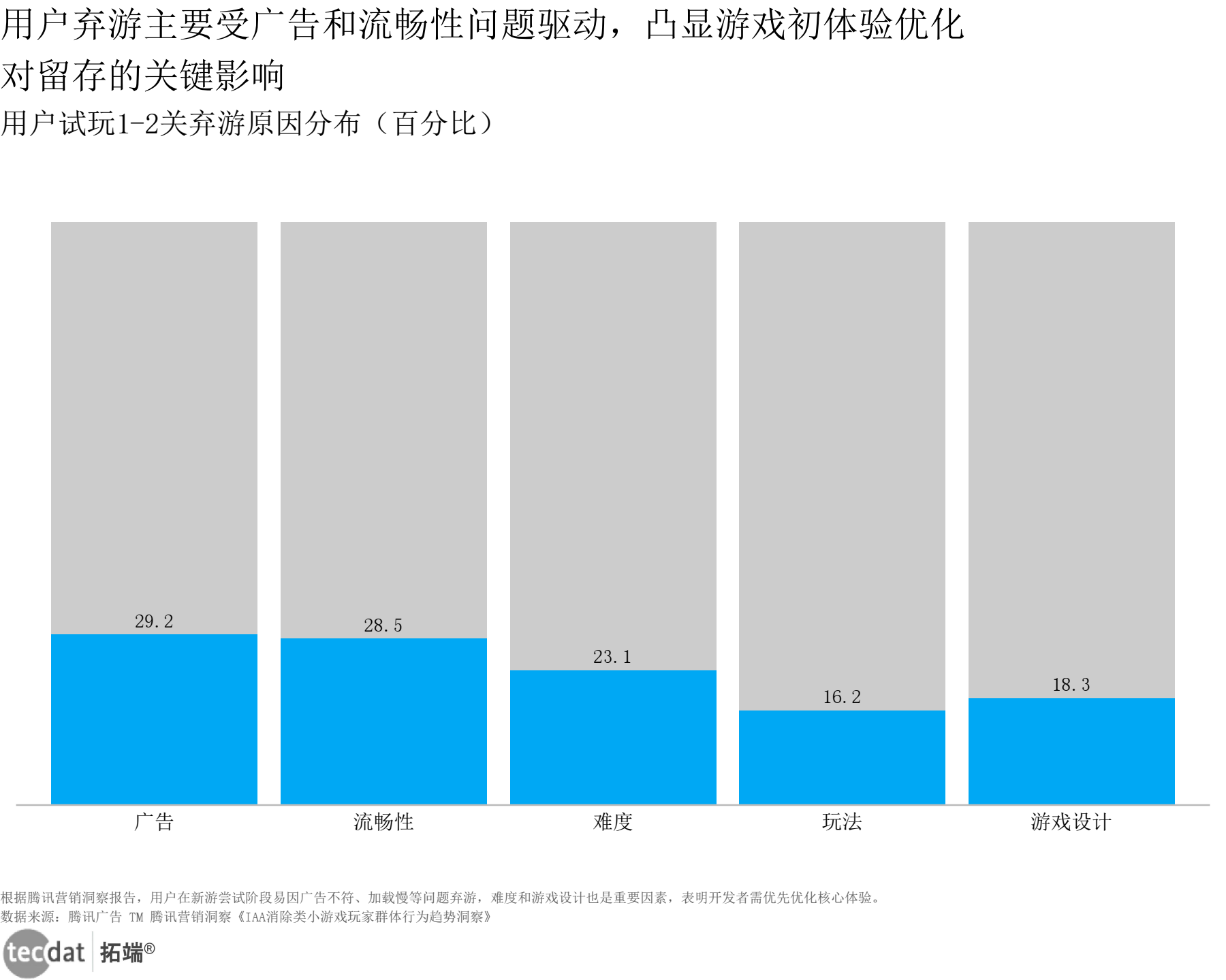 | 新游试玩1-2关弃游用户比例 | 91.5% | 腾讯广告&腾讯营销洞察《IAA消除类小游戏玩家群体行为趋势洞察》 |