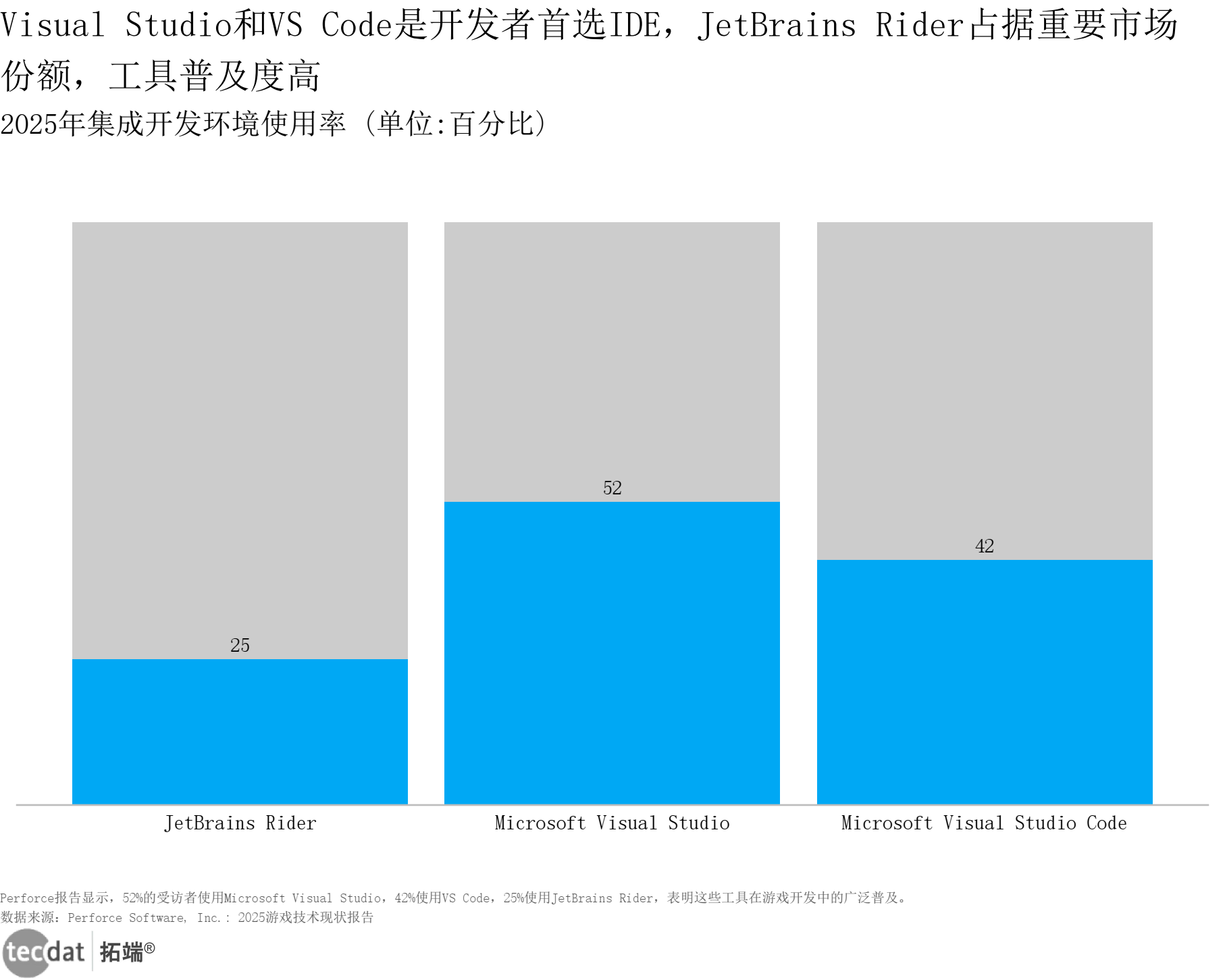 集成开发环境(IDE)市场格局稳定,“头部工具+生态适配”成为主流选择。Microsoft Visual Studio以52%的使用率位居第一,Microsoft Visual Studio Code(42%)、JetBrains Rider(25%)分列二三位,成为开发者日常工作的核心工具,其普及性降低了行业学习成本,让中小团队更易入局。