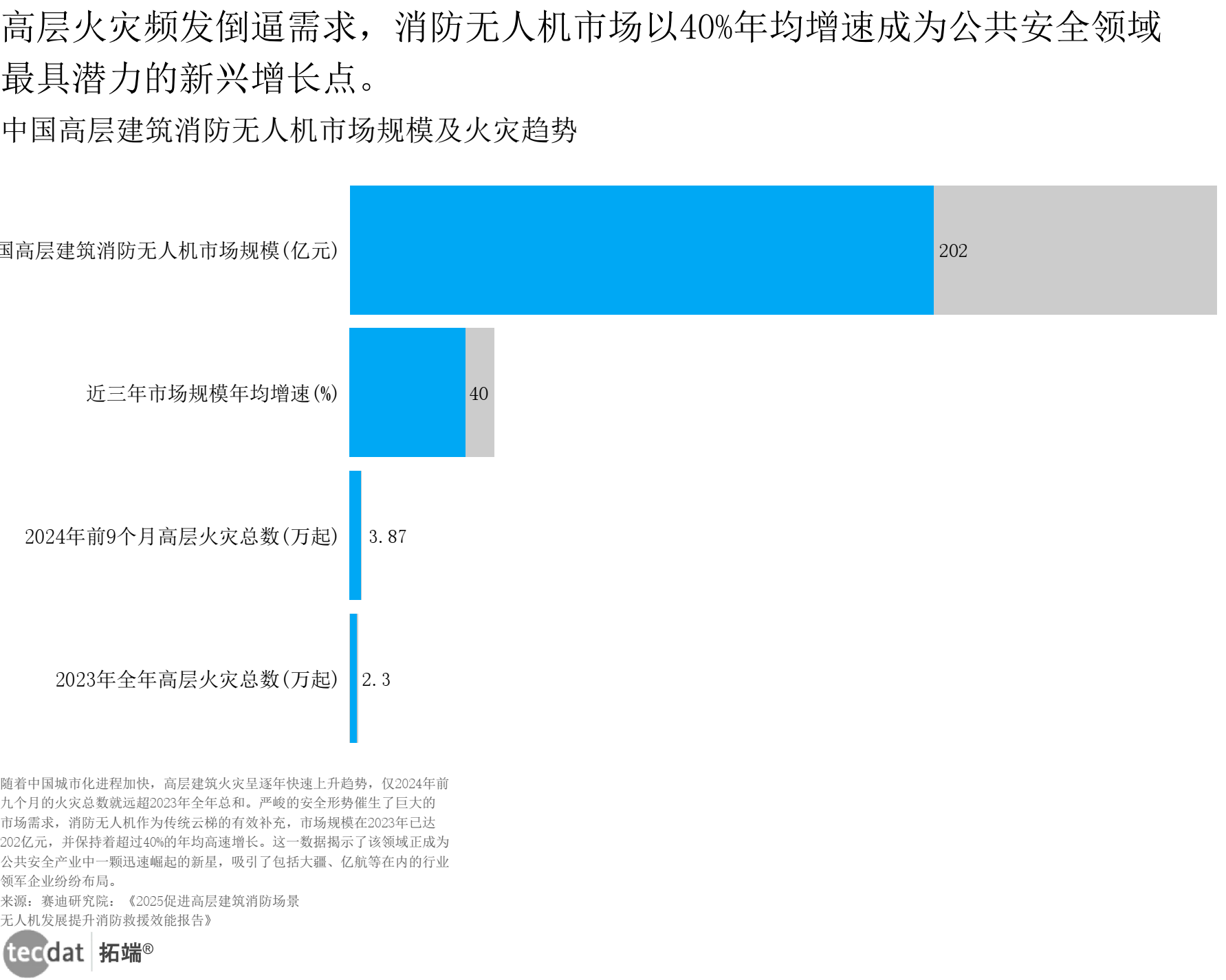 | 赛迪研究院:2025促进高层建筑消防场景无人机发展报告 | 2023年消防无人机市场规模202亿元,近三年增速超40% | 与其他咨询公司数据接近 | 基于政府采购网及企业调研,口径一致 |