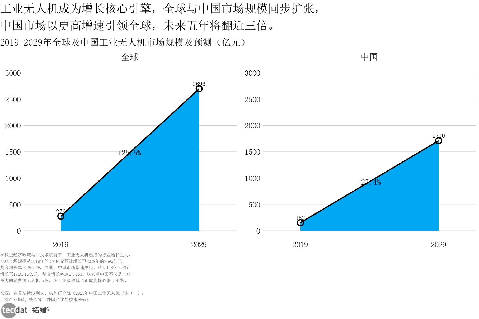 | 弗若斯特沙利文&头豹研究院 | 2029年中国工业无人机市场规模1710亿元,CAGR 27.35% | 高于其他机构预测 | 包含无人机硬件、软件及服务全口径 |