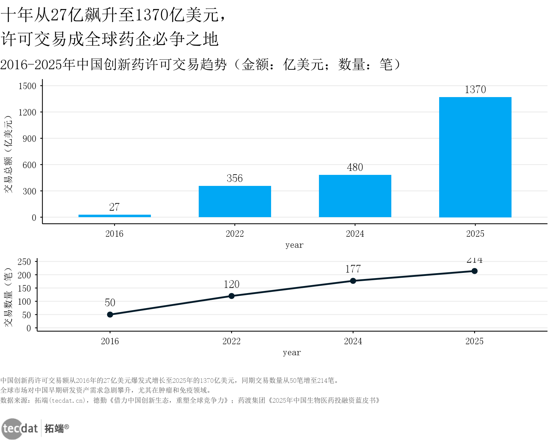 2016年,中国药企的对外许可(License-out)刚刚起步,全年仅27亿美元;到了2025年,这个数字飙升至1370亿美元。更值得注意的是,交易的”质量”也在提升:中国不再是”廉价原料”的代名词,而是早期创新资产的诞生地。
