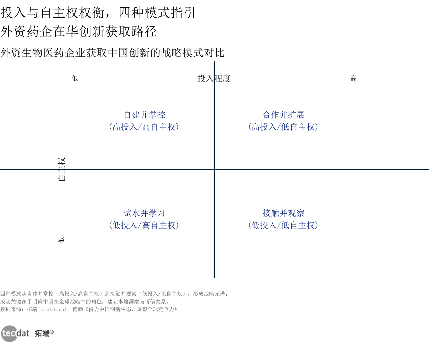 想象一下,你打算在一座城市扎根。你可以自己买地盖楼,也可以租个公寓,甚至可以只是常驻酒店。这就是外资药企在华获取创新的战略光谱:投入成本与自主权之间的权衡。德勤在报告中凝练出四种战略模式:自建并掌控、合作并扩展、试水并学习、接触并观察(见图外资生物医药战略模式四象限信息图3)。