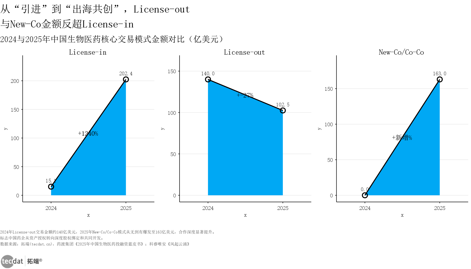 仅仅看交易总额还不够。真正体现产业升级的是交易模式的质变。德勤将这种变化归纳为:从单纯的”管线买卖”,进化为深度的”股权与能力共建”。过去,外资药企习惯的模式是License-in(授权引进),即从中国买走一两个药物的海外权益。而如今,以License-out(对外授权)和New-Co(成立合资实体)为代表的新模式已经在金额上完成了反超(见图外资生物医药交易模式升级多边形信息图2)。