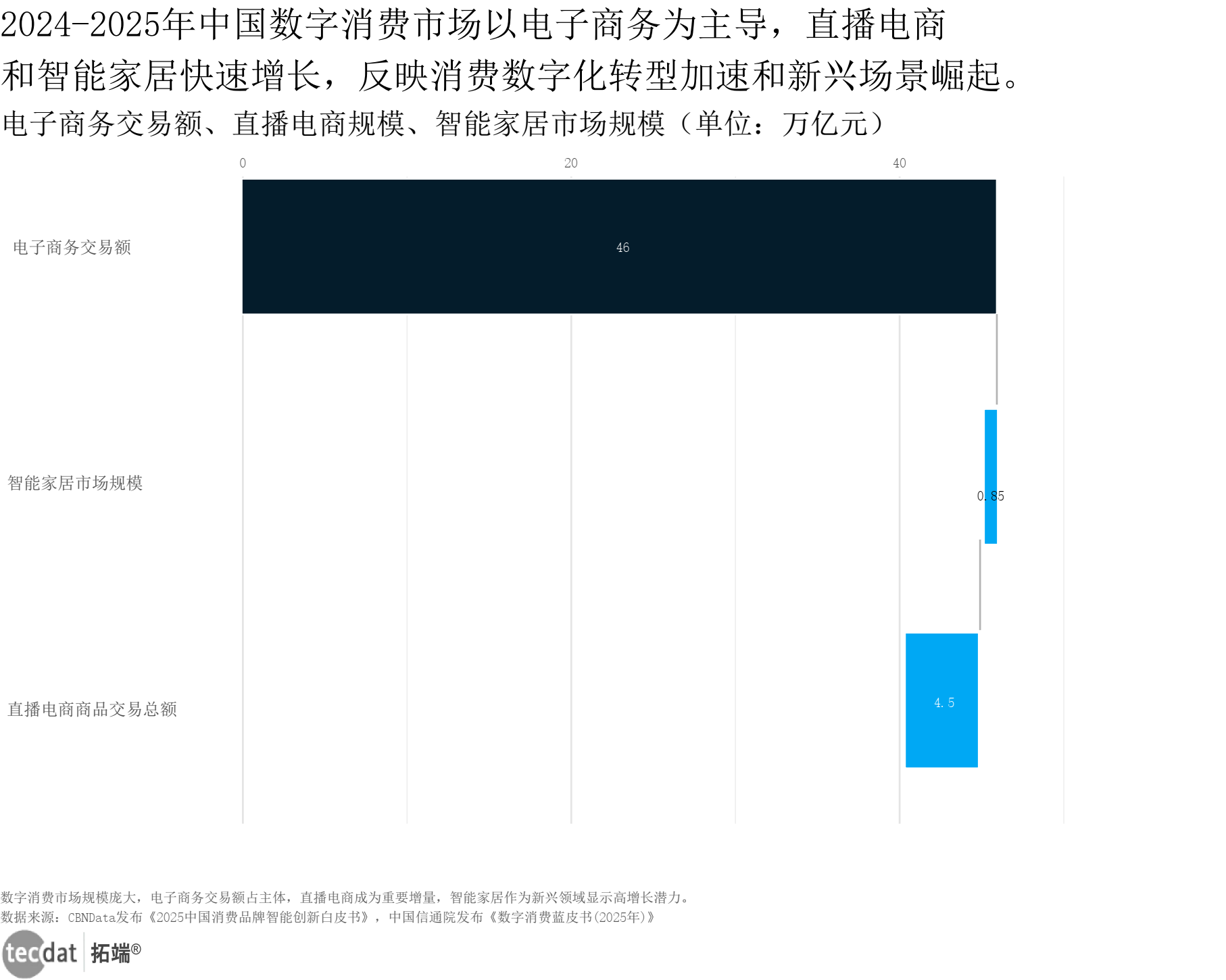 | 数字消费 | 中国信通院《数字消费蓝皮书(2025年)》 | 数字消费规模稳步增长,AI终端、数字服务渗透加速 | 2024年电商交易额46万亿元,直播电商4.5万亿元 | 统计范围涵盖全品类数字消费,含产品与服务消费 |