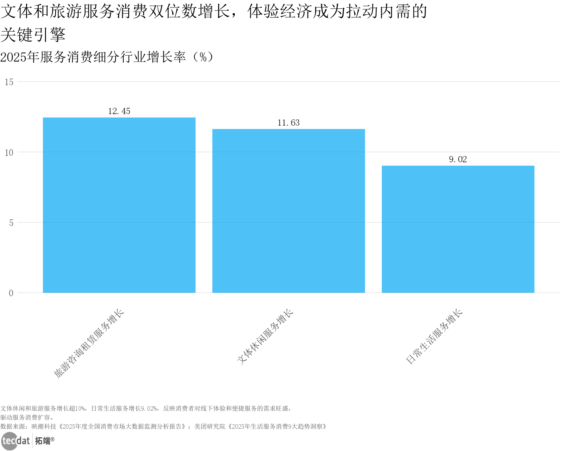 细分行业中,旅游咨询租赁服务以12.45%的增长率领跑,文体休闲服务增长11.63%,日常生活服务增长9.02%。线下体验与便捷服务需求的旺盛,推动服务消费向多元化、品质化方向发展,文体休闲与旅游服务的双位数增长,更是体验经济崛起的直接体现,成为拉动内需的关键力量。