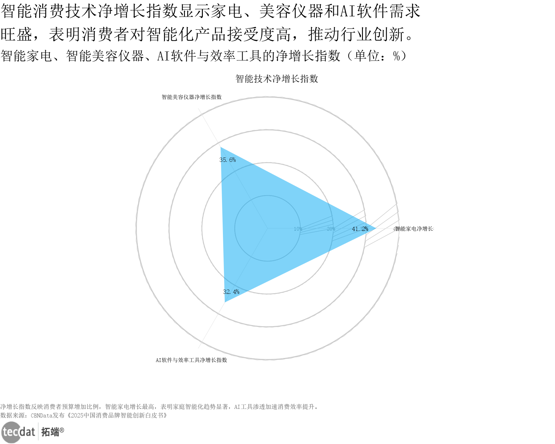 智能技术的消费渗透率持续提升,智能家电净增长指数41.2%位居首位,智能美容仪器35.6%、AI软件与效率工具32.4%紧随其后。净增长指数反映出消费者对智能化产品的预算投入持续增加,家庭智能化、个人护理智能化与效率提升类工具成为三大核心场景,推动消费向高效、便捷、个性化方向发展。