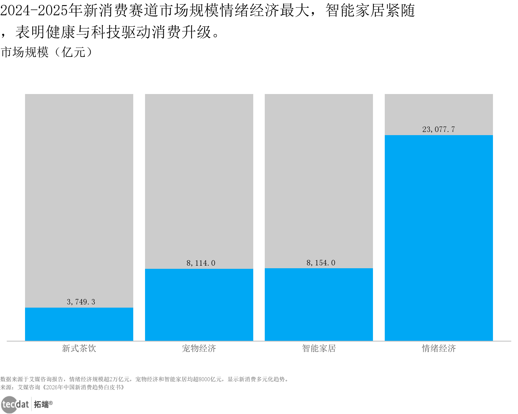 从市场规模维度,情绪经济以23077.7亿元的规模占据绝对主导,智能家居与宠物经济均突破8000亿元大关,分别达到8154亿元和8114亿元,新式茶饮市场规模也达到3749.3亿元。数据表明,健康管理、情感满足与科技赋能已成为新消费的核心驱动力,形成多元化的市场增长矩阵。