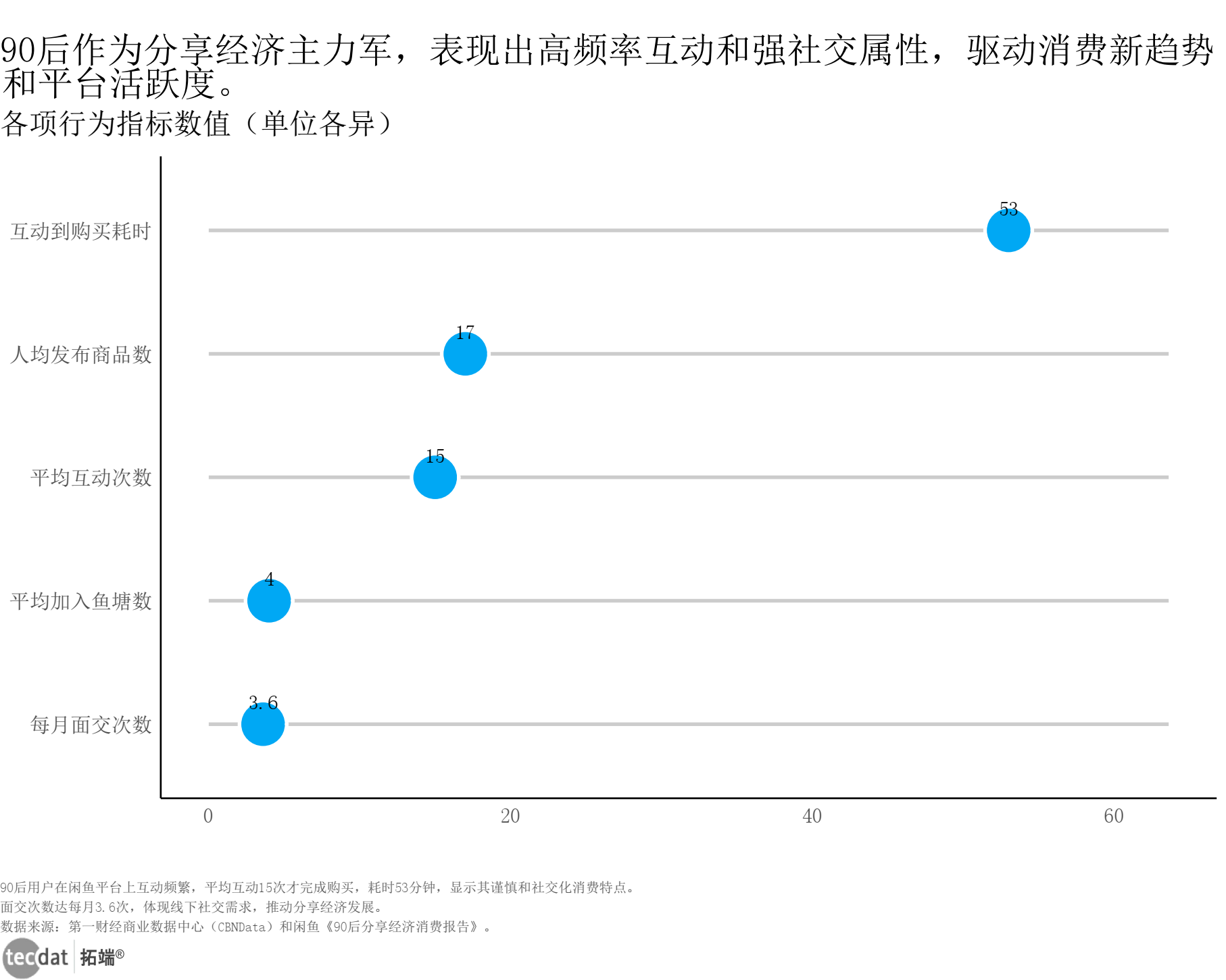 | 年轻人消费 | CBNData&闲鱼《90后分享经济消费报告》 | 90后是分享经济主力,高互动、强社交、爱面交 | 平均互动15次,每月面交3.6次,加入4个鱼塘 | 统计范围为闲置交易平台(闲鱼),样本侧重分享经济场景 |