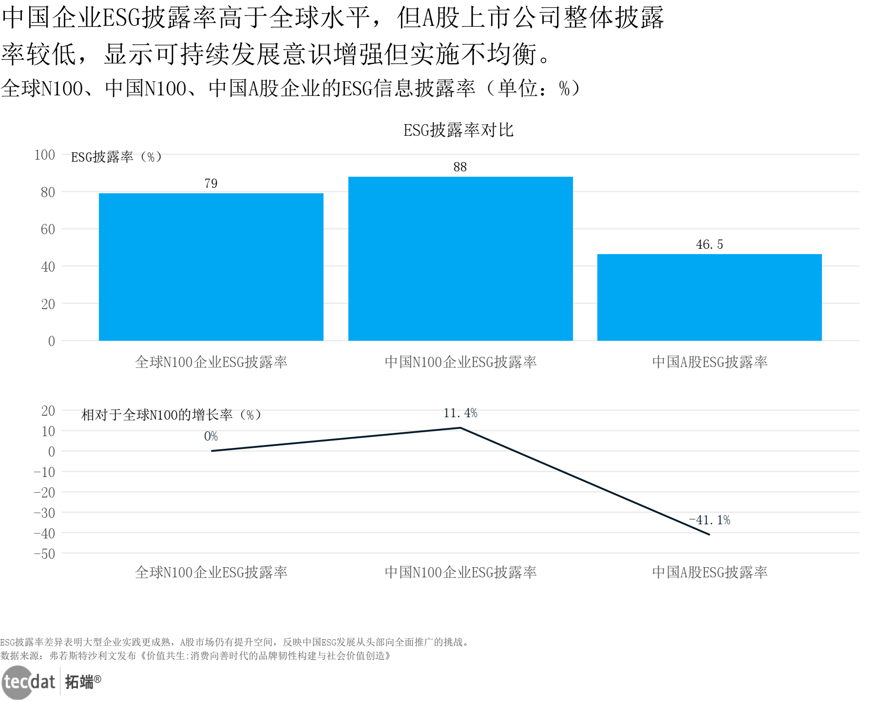 中国企业ESG(环境、社会、治理)披露意识逐步提升,但市场呈现分层特征。中国N100企业ESG披露率达88%,高于全球N100企业79%的平均水平,显示头部企业对可持续发展的重视;但中国A股上市公司ESG披露率仅46.5%,与头部企业差距显著,反映出ESG实践在不同规模、不同类型企业中的实施不均衡。这一格局表明,ESG已从可选责任转变为头部企业的必选动作,但全面推广仍需时间。