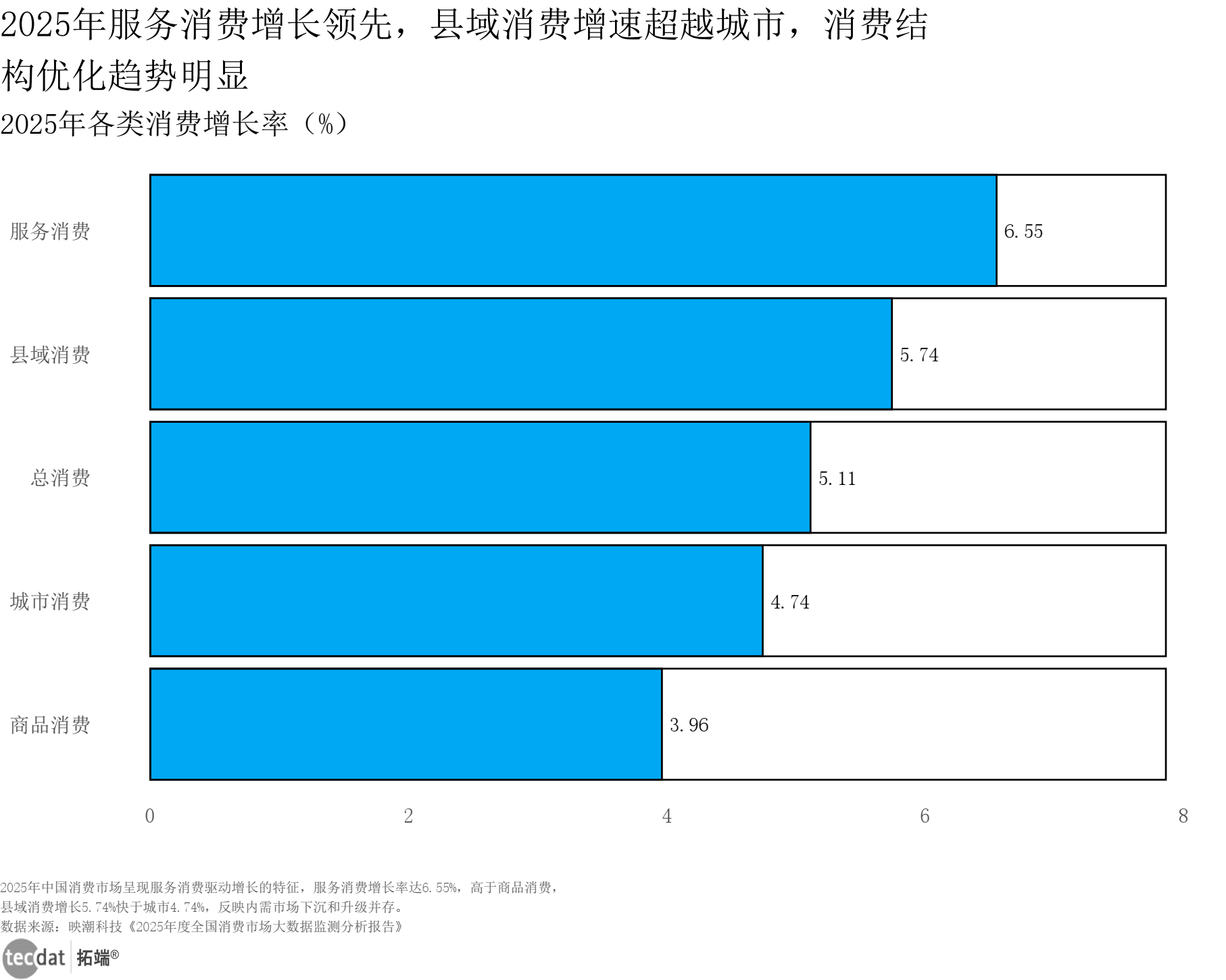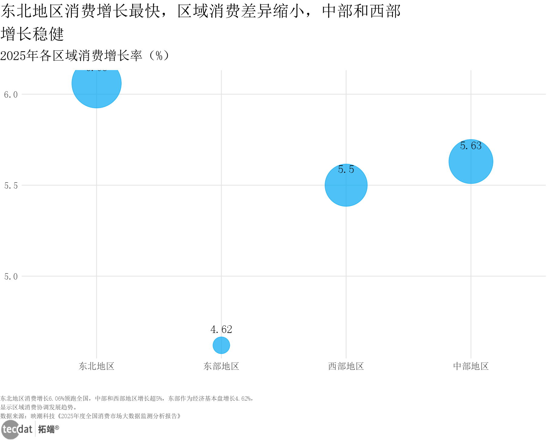 从全国区域消费增长来看,2025年服务消费增长率6.55%显著高于商品消费3.96%,县域消费增长5.74%超越城市消费4.74%,区域层面东北地区以6.06%的增速领跑,中部(5.63%)、西部(5.50%)增速稳健,东部地区4.62%的增长彰显经济基本盘的稳定性。这种格局反映出消费市场“下沉升级”与“区域协调”的双重趋势。