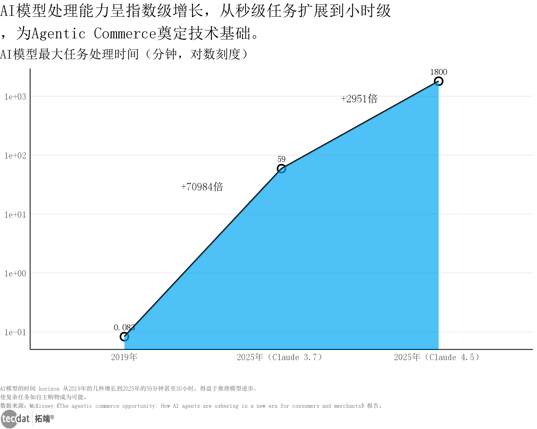 智能技术的演进正深刻改变消费逻辑,AI模型处理能力的指数级增长为新消费形态奠定基础。从2019年秒级任务处理到2025年小时级复杂任务承接,AI对消费场景的支撑能力大幅提升,自主购物、智能导购等新场景即将落地。