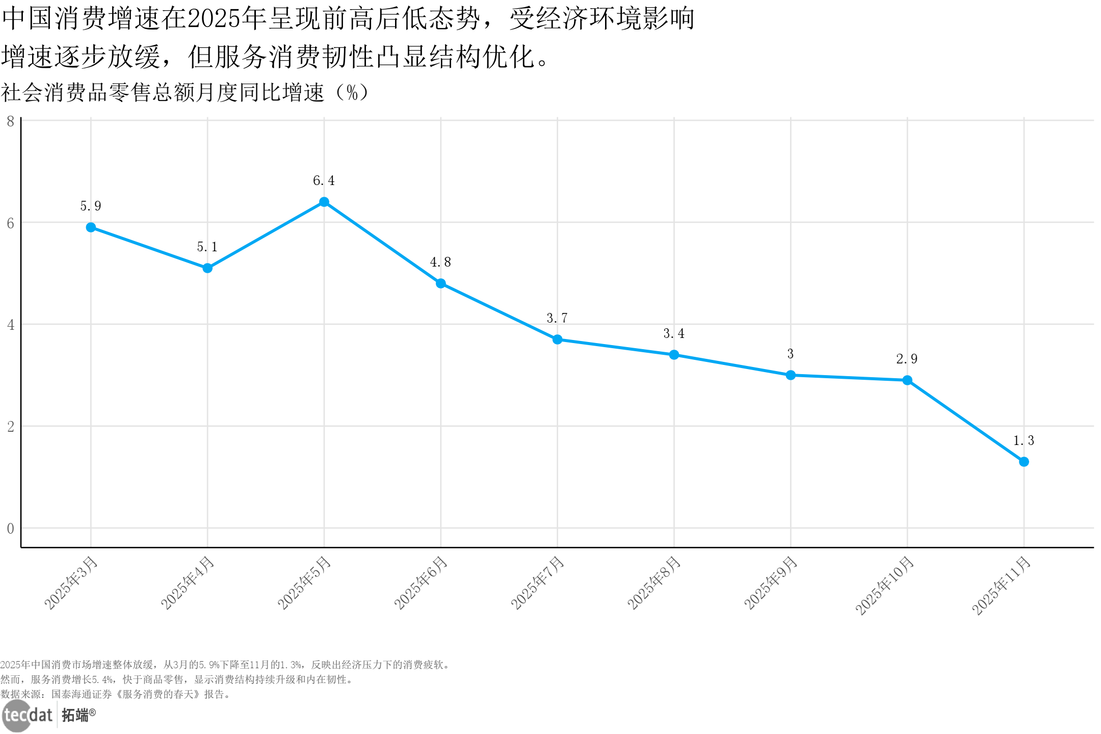 2025年中国消费市场增速呈现前高后低态势,社会消费品零售总额月度同比增速从3月的5.9%逐步回落至11月的1.3%,反映出经济环境对消费市场的阶段性影响。但从结构来看,服务消费增长5.4%,显著快于商品零售增速,这种结构性差异凸显了消费市场的内在韧性,消费升级的长期趋势并未改变。
