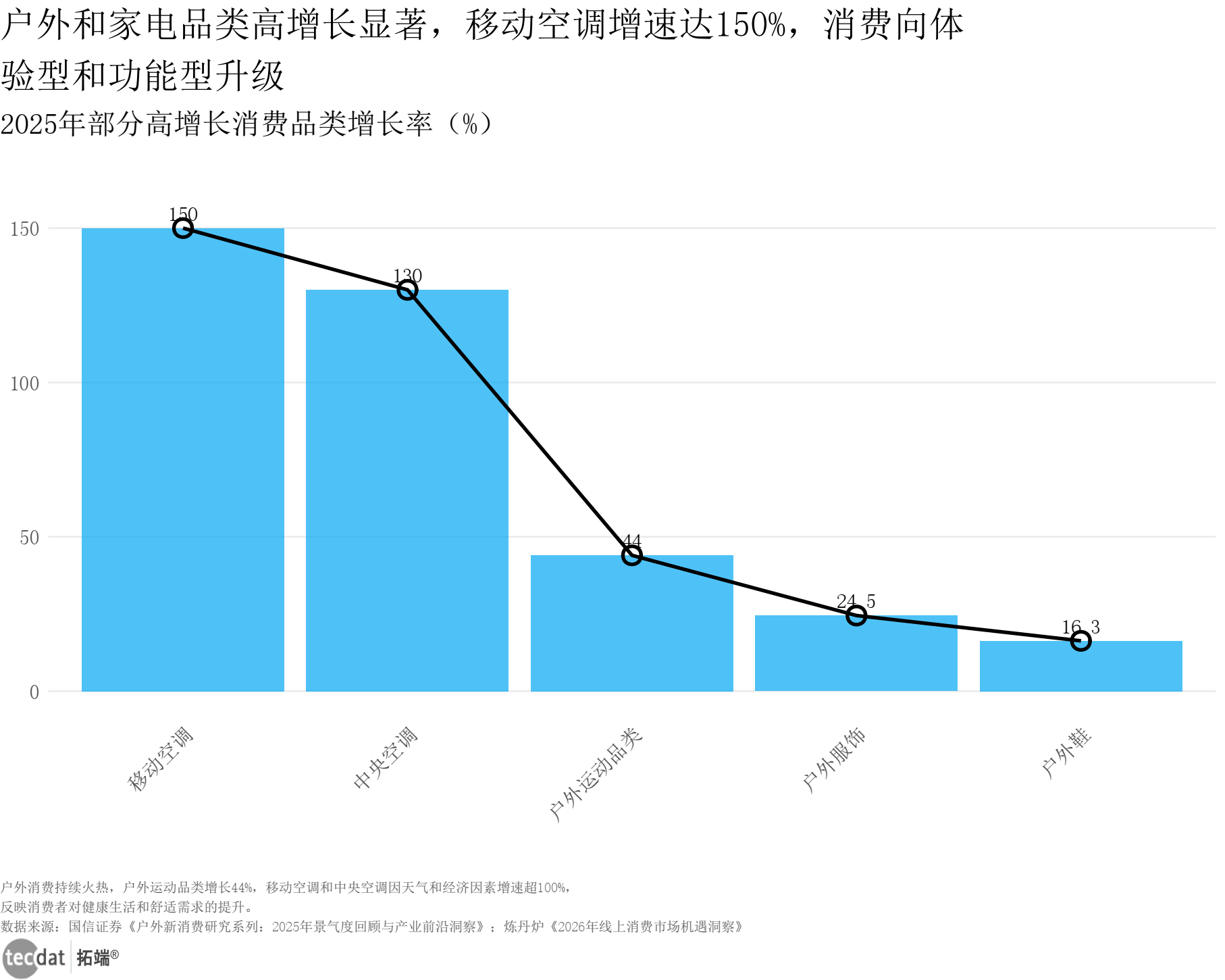 细分品类中,体验型与功能型消费呈现爆发式增长。户外消费持续火热,户外运动品类整体增长率达44%,户外服饰(24.5%)、户外鞋(16.3%)同步高增,成为健康生活方式的重要载体。