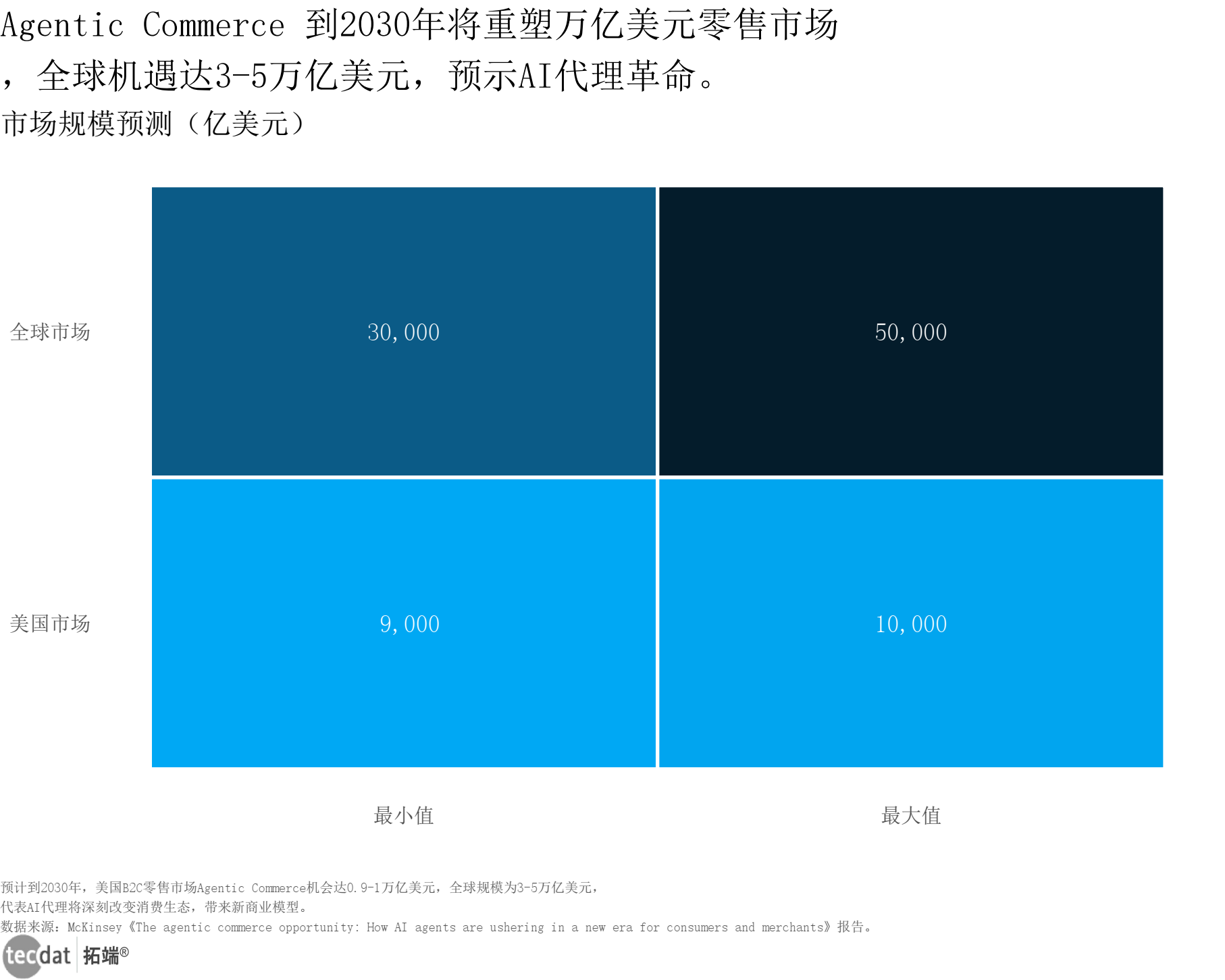 年轻群体对新消费形态的接受度领先,Agentic Commerce(智能代理消费)作为新兴模式,正逐步进入大众视野。预测2030年Agentic Commerce全球市场规模达3-5万亿美元,美国B2C零售机会0.9-1万亿美元,90后作为数字原住民,将率先拥抱这一模式,推动消费向更智能、更个性化方向发展。