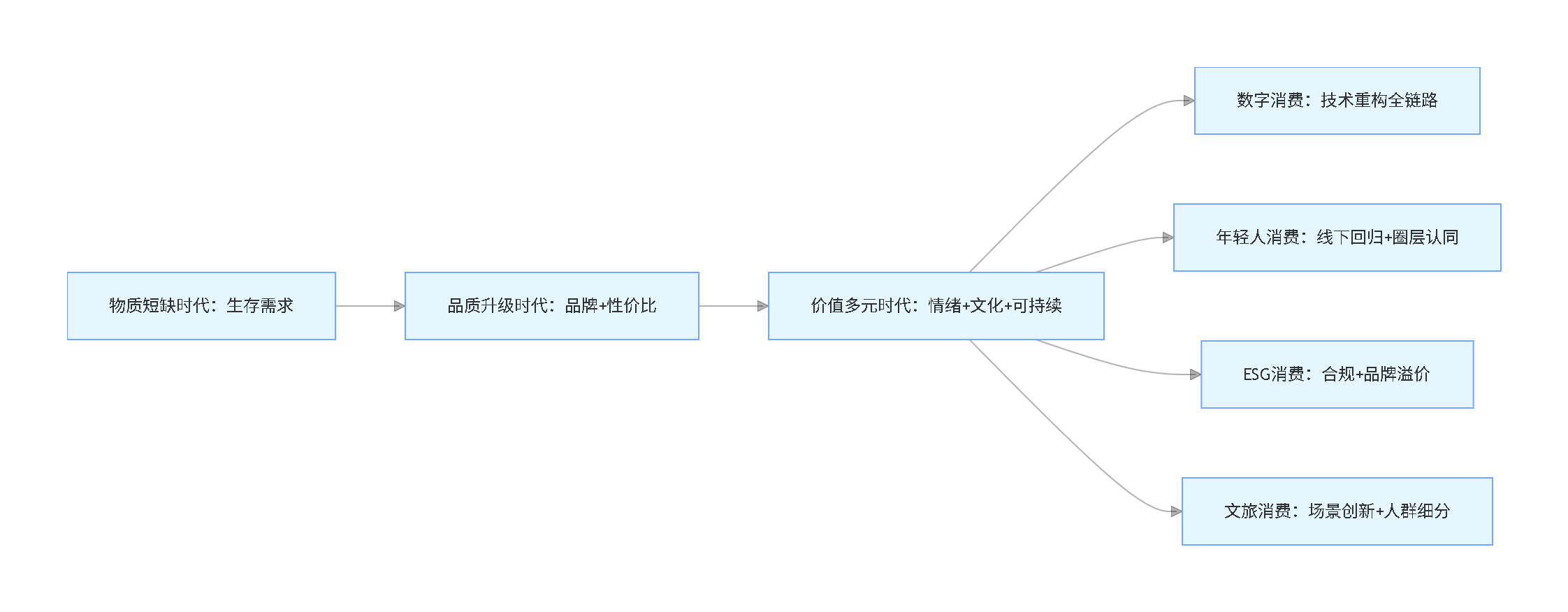 从数字消费的技术赋能到年轻人线下消费的情绪驱动,从ESG的政策合规到文旅消费的场景创新,消费行业的边界不断拓展。早期物资短缺时代,消费核心是满足基本生存;随着收入提升,转向品质与性价比;如今数字技术与年轻群体崛起,消费进入”价值多元”阶段,情绪价值、文化认同、可持续发展成为新决策维度。这一演进是居民收入增长、数字基建完善、社会观念升级共同作用的结果,也让消费行业从”产品为王”转向”用户价值为王”。本报告将梳理行业演进脉络,拆解核心趋势下的机会点,为不同类型从业者提供可落地的行动参考。