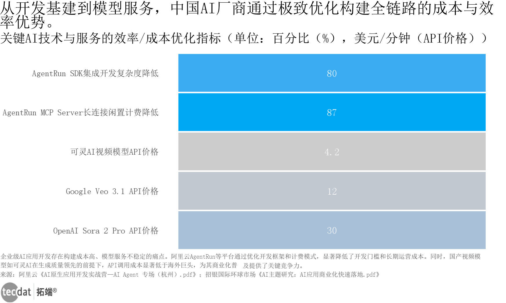 3秒解读:AgentRun平台将AI应用开发复杂度降低了80%,MCP Server长连接闲置计费最高降低87%,大幅降低了企业级AI应用的开发与运营成本;在视频生成API价格上,国产可灵AI仅为4.2美元/分钟,而Google Veo 3.1为12美元/分钟,OpenAI Sora 2 Pro达到30美元/分钟,国产模型在成本上具备显著的优势。