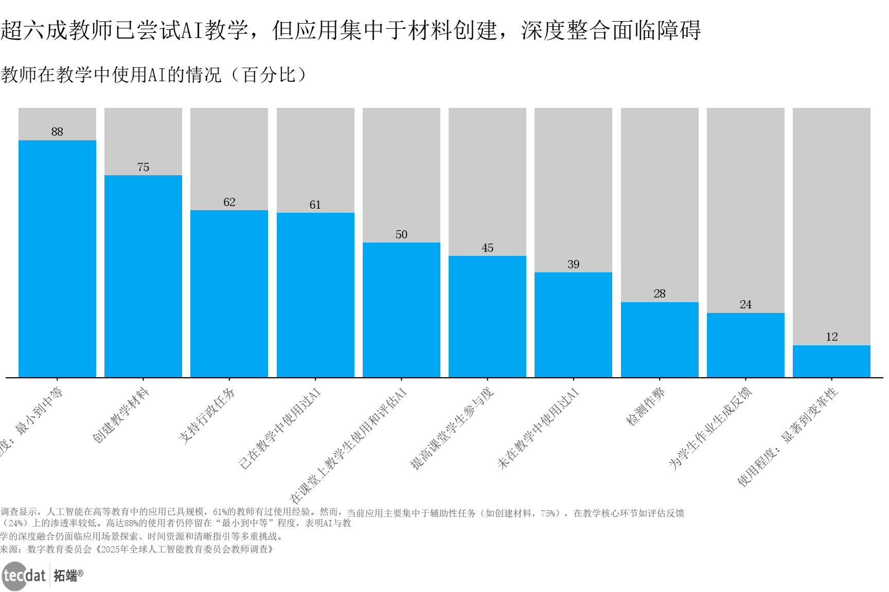 | 数字教育委员会:2025年全球人工智能教育委员会教师调查 | 全球61%的高校教师已在教学中使用AI,88%的使用者仍处于浅度应用阶段 | 与国内高校AI教师渗透率调研数据存在差异,国内部分调研显示高校教师AI使用率为48%,低于全球均值 | 1. 统计范围不同:该报告覆盖全球28个国家欧美高校占比更高,国内调研仅覆盖中国内地高校;2. 时间周期不同:该报告调研时间为2025年,国内部分调研为2024年,存在时间差;3. 统计口径不同:该报告将「创建教学材料」等轻量应用纳入使用统计,部分国内调研仅统计深度融入教学环节的使用行为 |
