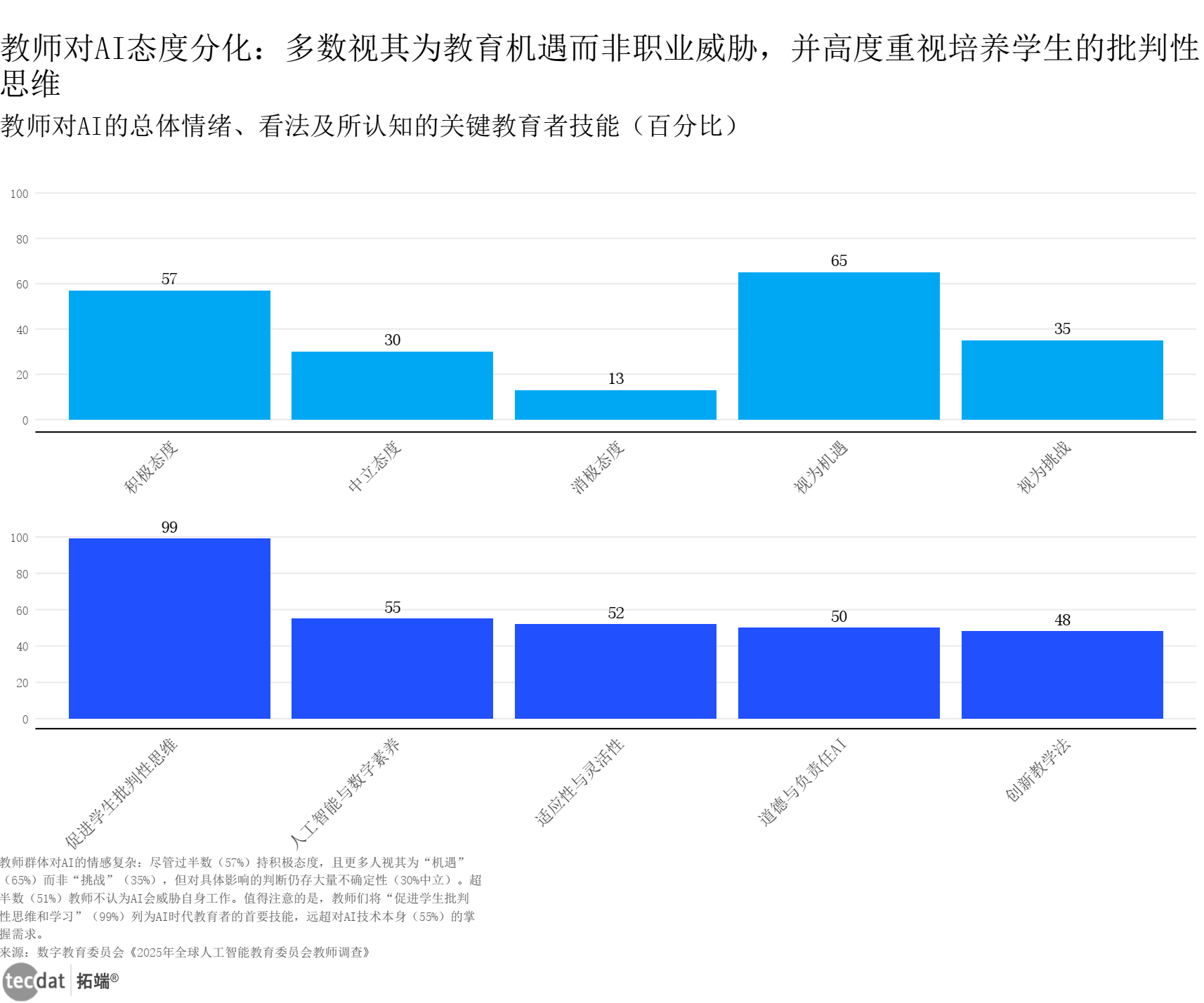 3秒解读:57%的教师对AI在教育中的应用持积极态度,65%的教师将AI视为教育发展的机遇,仅有35%的教师视其为挑战;同时51%的教师不认为AI会威胁到自身的工作,职业焦虑并非教师群体的主流情绪;在AI时代教育者的核心技能排名中,81%的教师将「促进学生批判性思维和学习」放在首位,远超对「AI与数字素养」本身的技能需求。