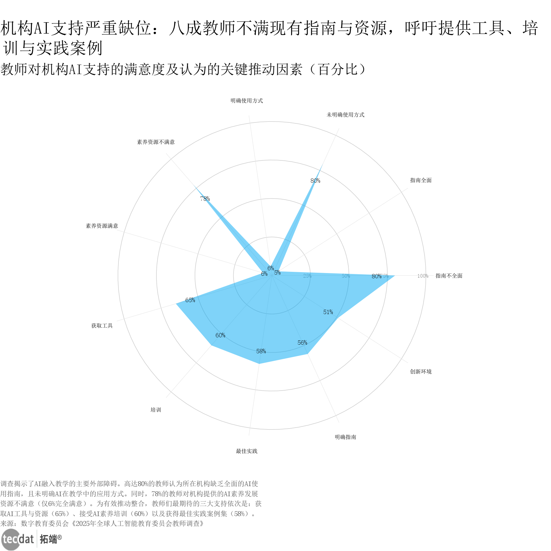 | 机构支持雷达图表A3 | 教师对机构AI支持的满意度 | 指南不全面80%、未明确使用方式80%、素养资源不满意78%、获取工具需求65%、培训需求60% | 数字教育委员会《2025年全球人工智能教育委员会教师调查》 |