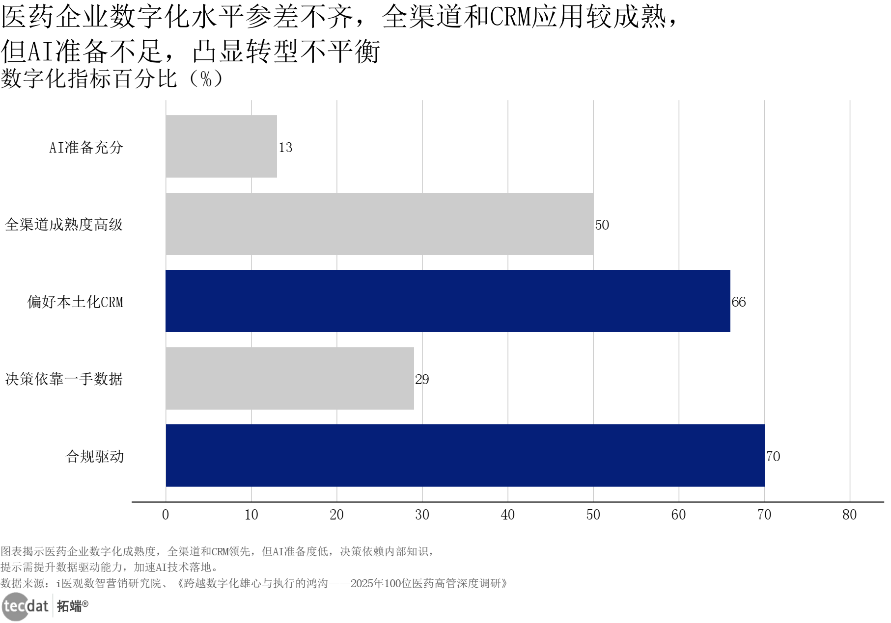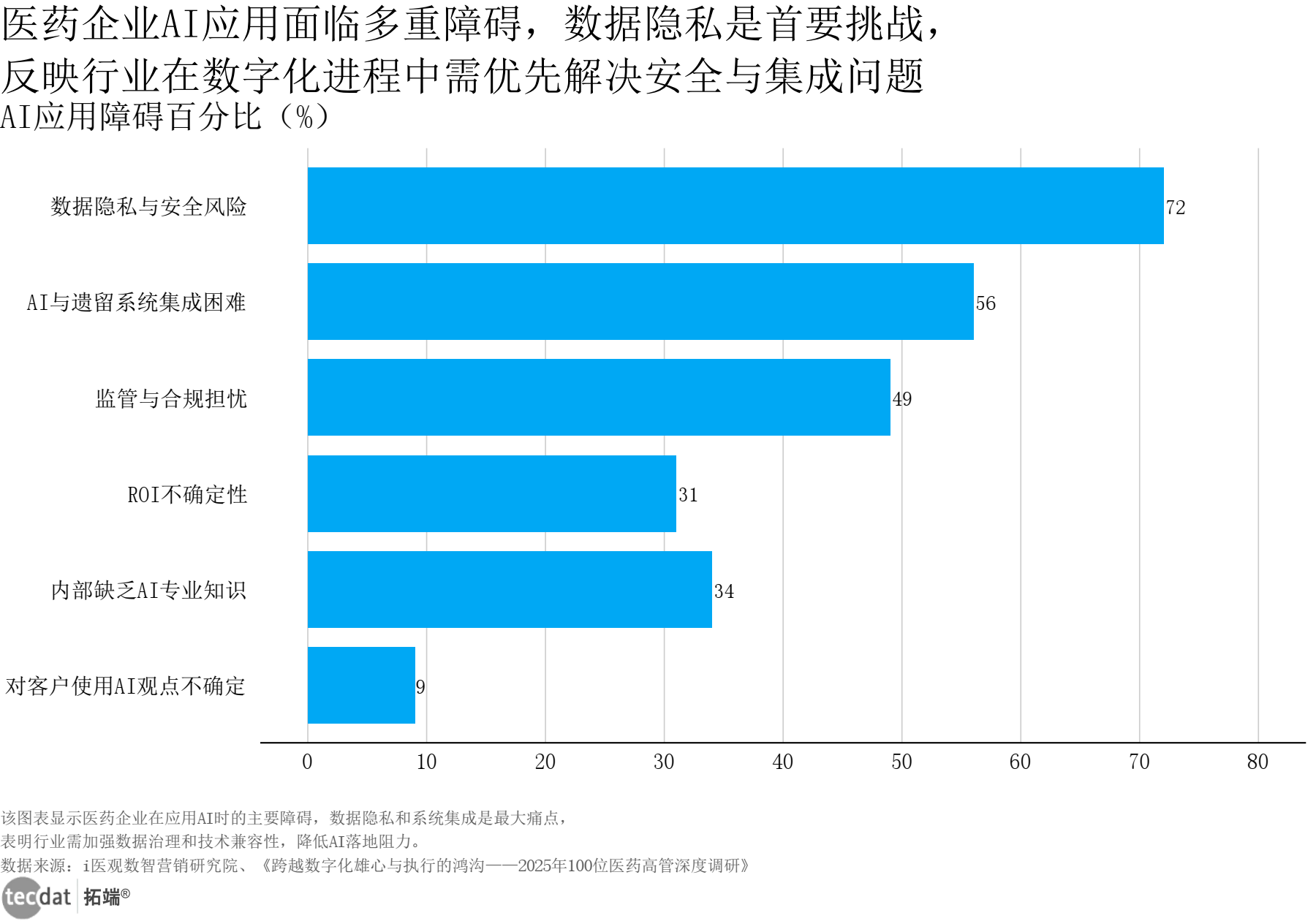 医药企业在AI应用中仍面临数据安全、技术适配等障碍,数字化指标分布呈现“基础应用普及、深度应用不足”的特征。
