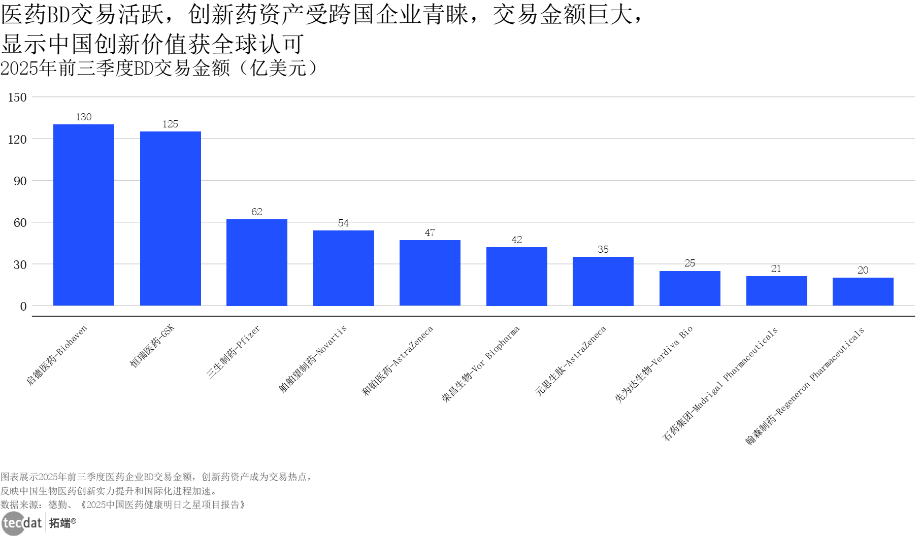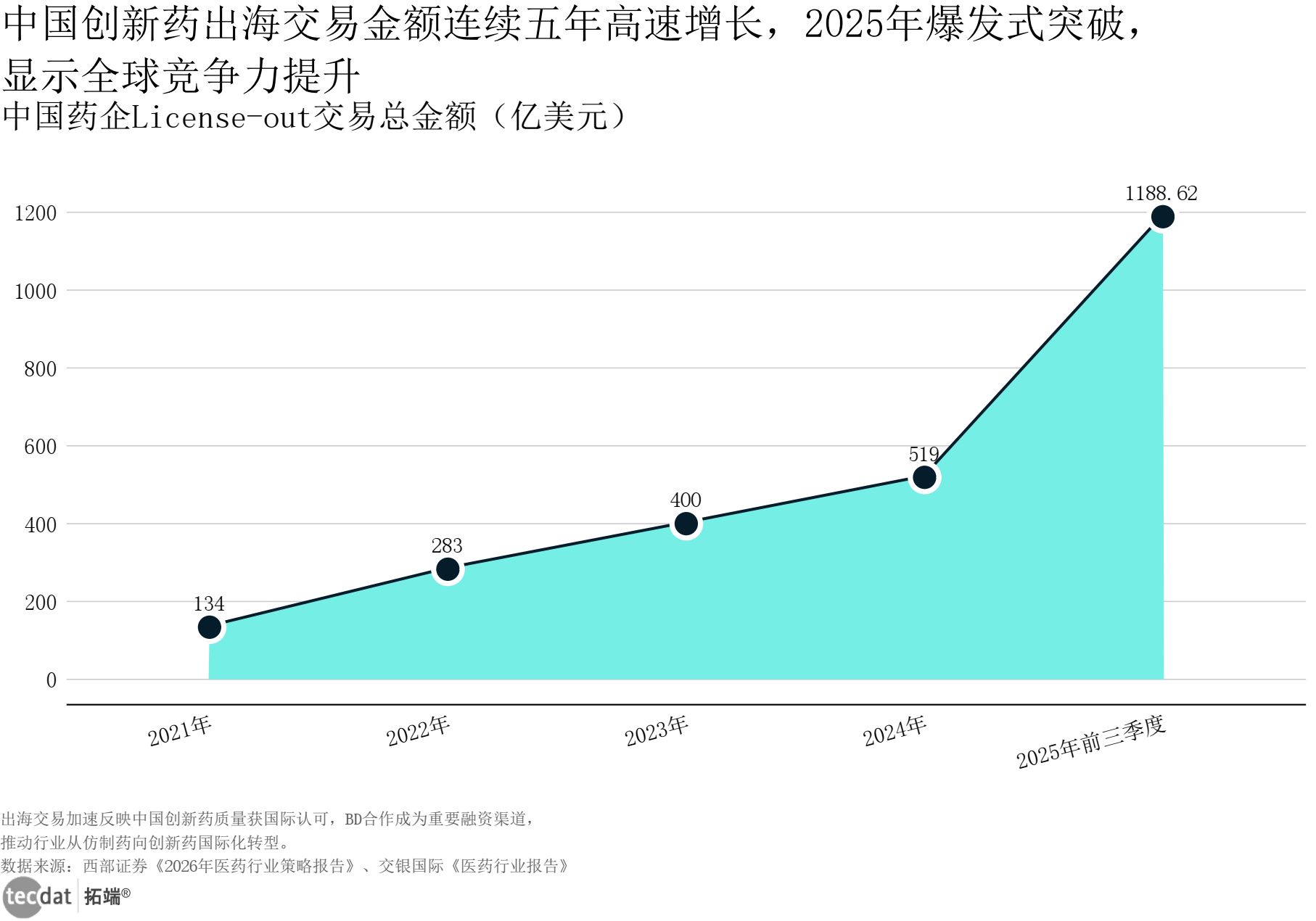 2025年前三季度,中国药企达成103项出海交易,披露总金额超2024年全年的1.77倍,交易模式从传统License-out向Co-Co(共同开发+共同商业化)演进,信达生物与武田114亿美元合作成为典型案例。