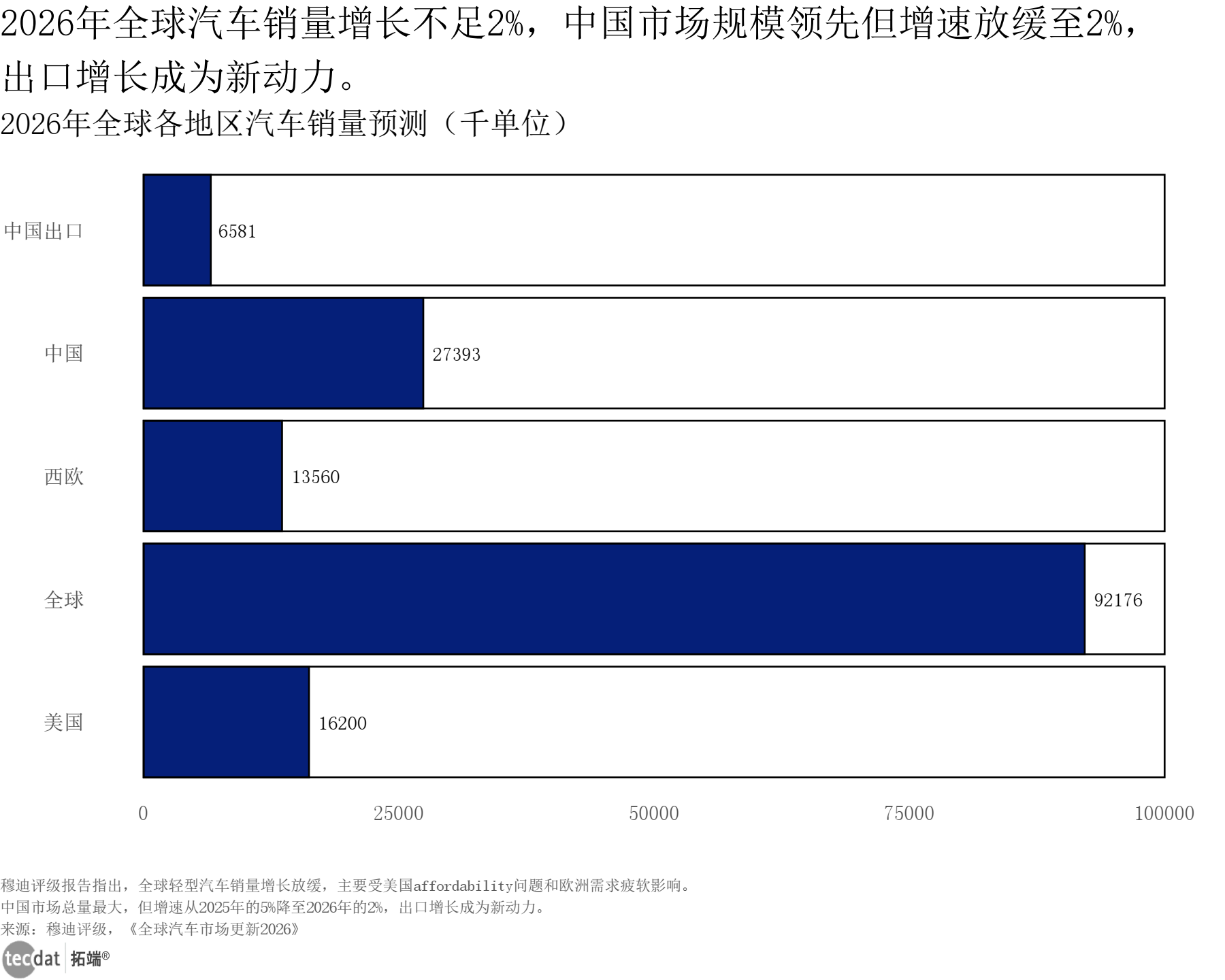 全球轻型汽车销量2026年增长不足2%,其中美国受购买力问题、欧洲受需求疲软影响增速放缓,而中国市场虽规模领先(2739.3千单位),但增速从2025年的5%降至2%,出口(658.1千单位)成为关键增长引擎。中国出口车型的核心竞争力,仅仅是轻量化材料吗?