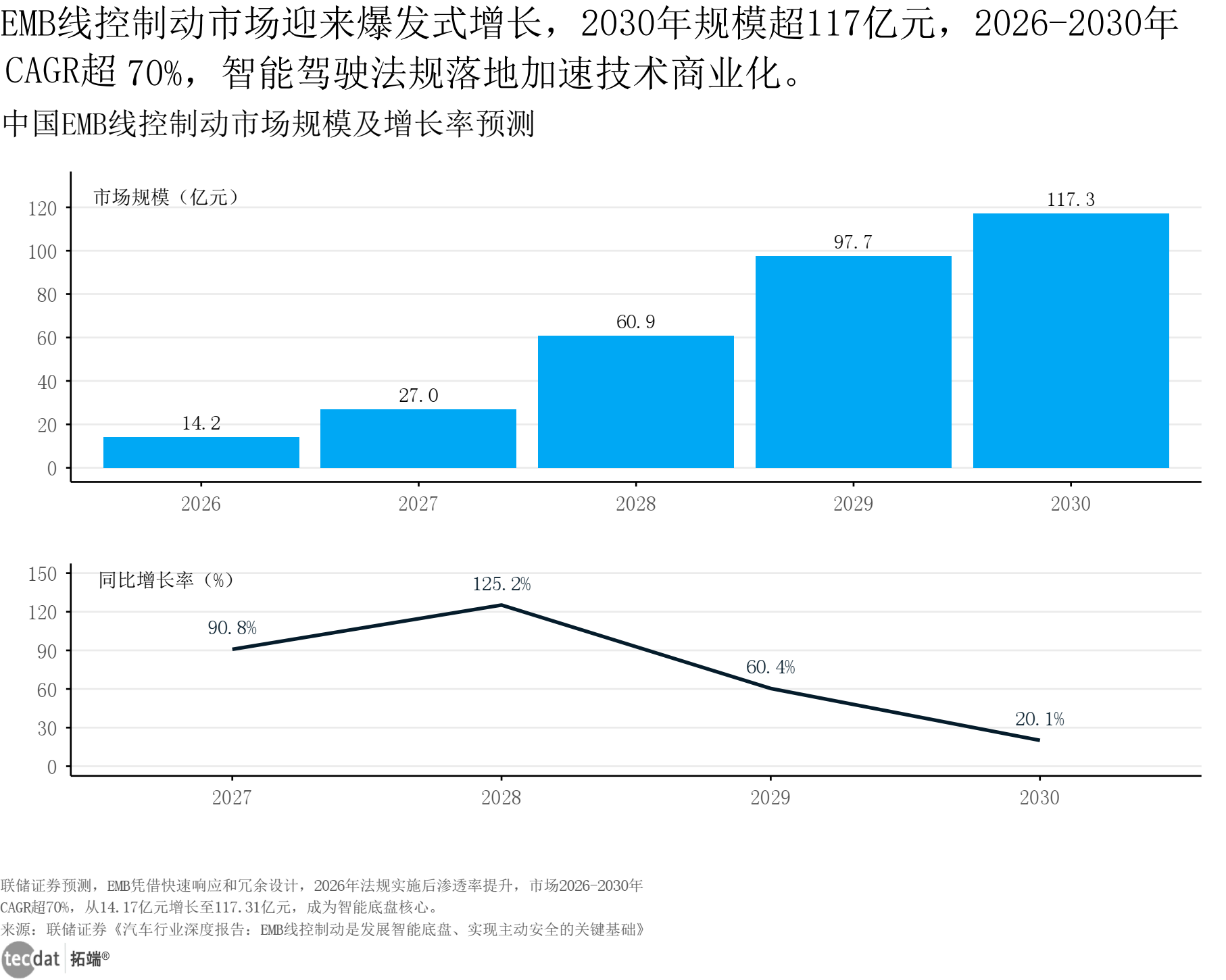 EMB线控制动市场迎来爆发式增长,2030年规模超117亿元,2026-2030年CAGR超70%,智能驾驶法规落地加速技术商业化。
