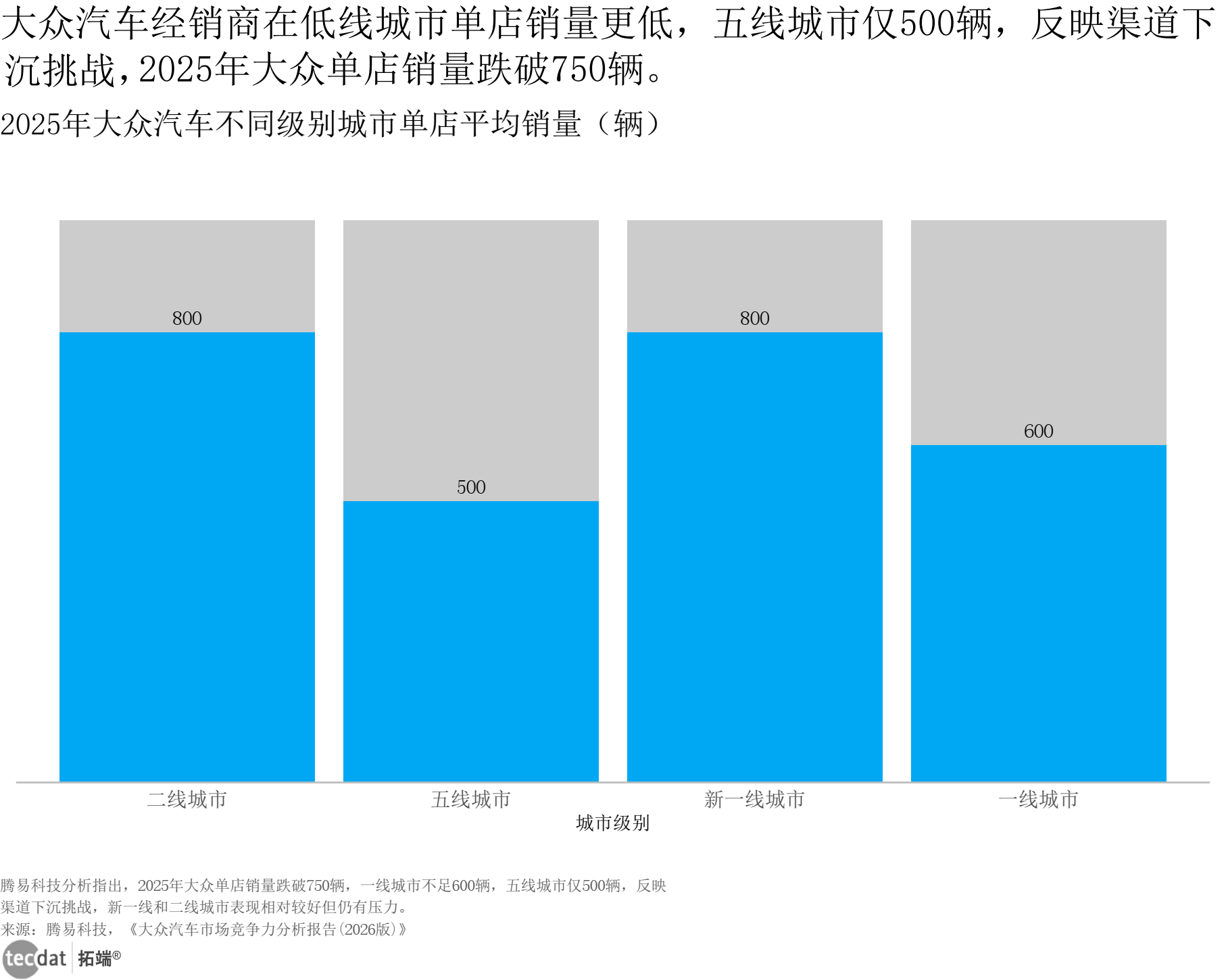 大众汽车经销商在低线城市单店销量更低,五线城市仅500辆,反映渠道下沉挑战,2025年大众单店销量跌破750辆。