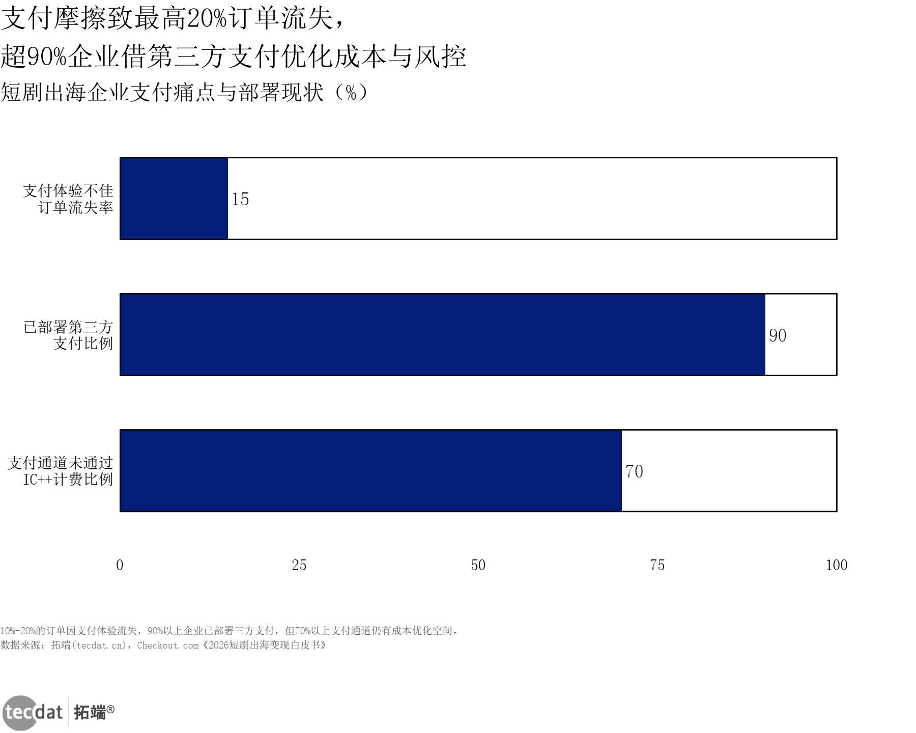 Checkout.com 的调研显示,超过90%的出海短剧企业已经部署了第三方支付,但 超过70%的企业支付通道尚未通过IC++透明计费(见短剧出海支付痛点与优化比例横向比例条形图表3)。这意味着大部分企业仍在为不透明的支付成本买单。