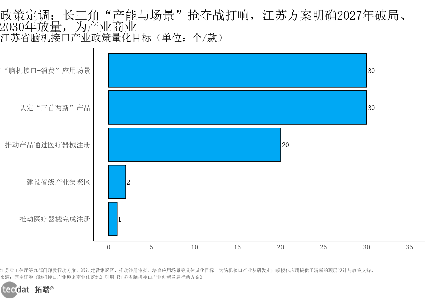 | 图表5 | 江苏省脑机接口产业政策量化目标 | 横向条形图 | 西南证券引用《江苏省脑机接口产业创新发展行动方案》 |