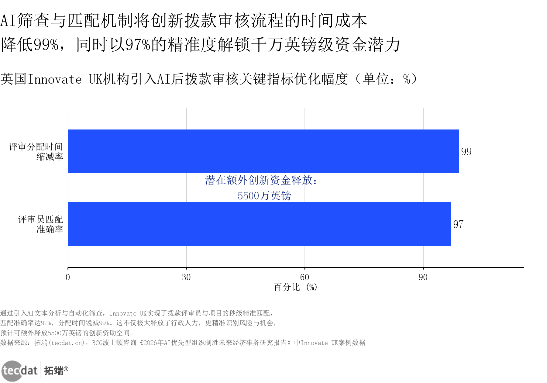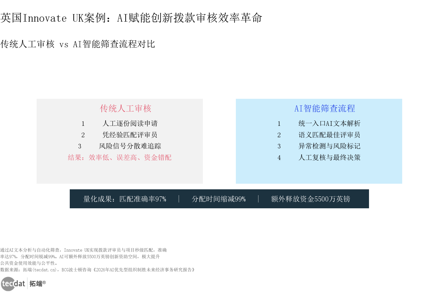 结果是颠覆性的:评审员分配时间锐减99%,相当于从数天压缩至数秒;潜在释放的额外创新资助金额高达5500万英镑。AI不仅没有取代人,反而将宝贵的人力从低价值重复劳动中解放出来,专注于更高价值的判断与决策。