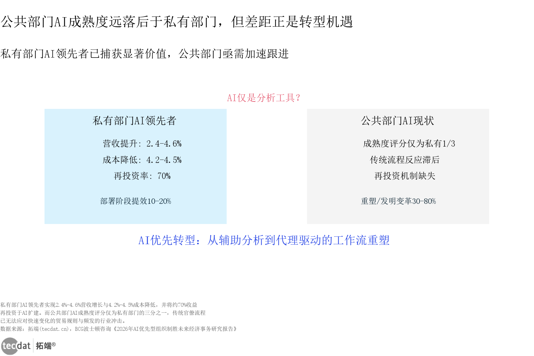 翻开这份报告,最直接的冲击来自一组数据对比。私有部门的AI领先者已悄然实现2.4%至4.6%的营收提升,以及4.2%至4.5%的成本缩减。更值得注意的是,他们将约70%的效率红利重新投入AI扩建,形成了持续领先的正向循环。与之形成鲜明对比的是,公共经济事务部门的AI成熟度评分平均仅为私有部门的三分之一。