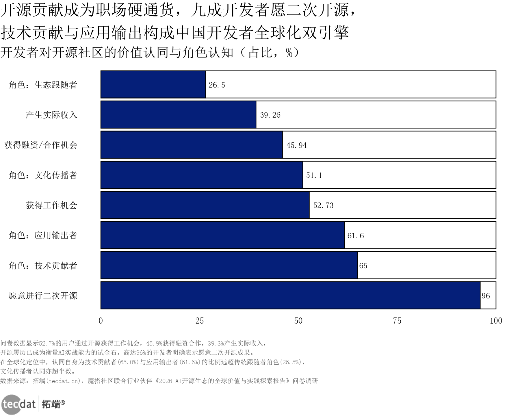魔搭社区联合行业伙伴于2026年发布的《AI开源生态的全球价值与实践探索报告》,用超过20万用户的调研数据告诉我们:开源的红利,从来不属于只会“调用”的人,而属于敢于“贡献”的二次创作者。 本文将带你穿透数据,看清开源生态真正的价值阶梯。