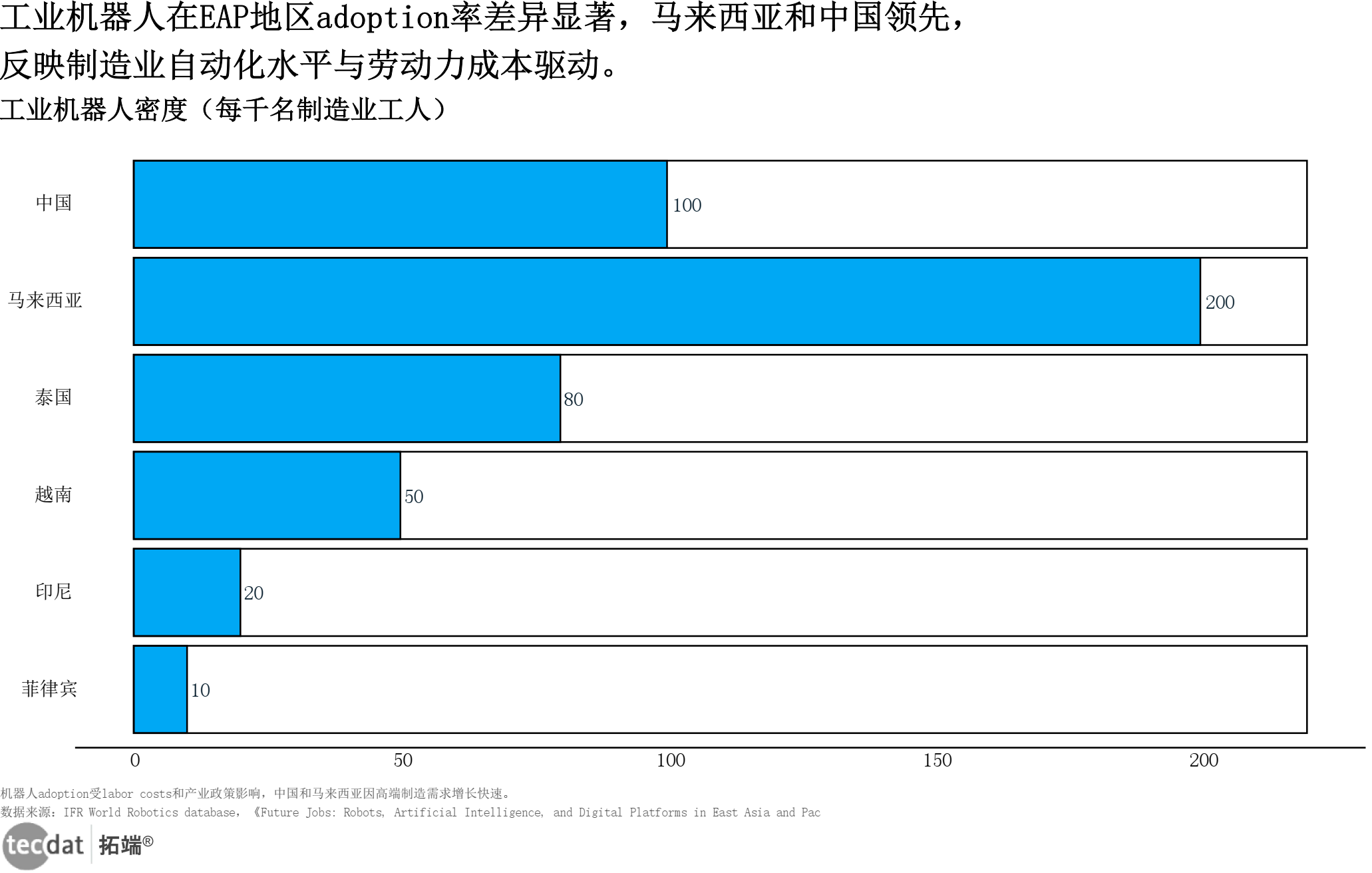 一、产业根基:工业机器人的区域渗透差异 要摸清机器人产业的“基本盘”,工业机器人的区域密度是最佳“标尺”——它直接反映了制造业自动化的“真实水位”。在东亚及太平洋(EAP)地区,各国的自动化进程呈现明显分层:中国和马来西亚凭借产业政策与高端制造需求领跑,而菲律宾、印尼等国仍处于“自动化启蒙”阶段。下图清晰展示了EAP地区主要国家的工业机器人密度,每个数据背后都是当地制造业的转型故事: