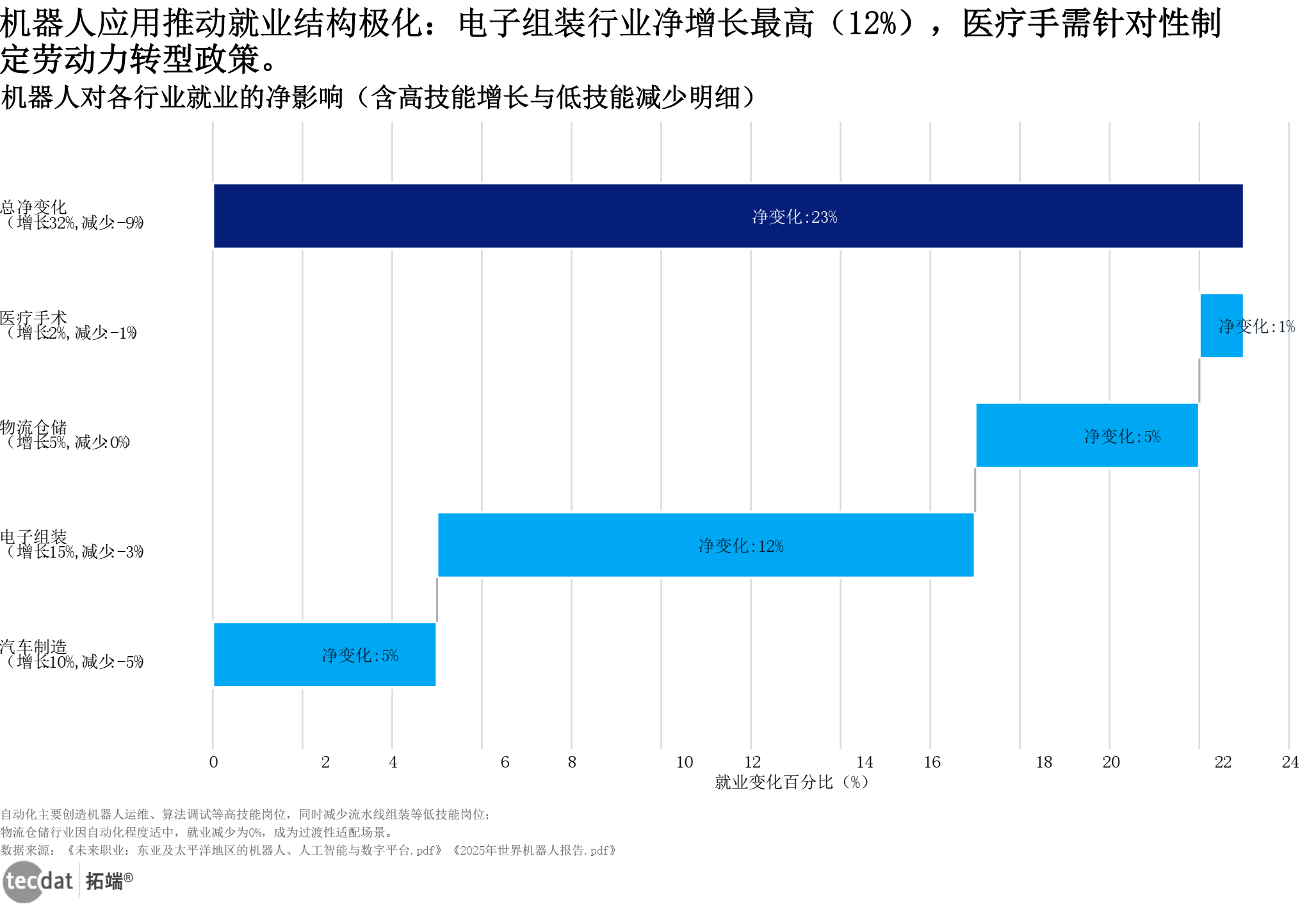 电子组装行业的就业增长最突出(15%),主要是机器人运维、算法调试等岗位需求爆发——深圳某电子厂2024年新增50个机器人运维岗,月薪比传统组装岗高40%;但低技能组装岗减少3%,净就业变化达12%。医疗手术行业增长最缓(2%),因为这类场景需要人类医生主导,机器人仅辅助完成“骨骼定位”等步骤,低技能岗位(如器械传递)减少也最少(1%)。3秒解读:电子组装(净增12%)、汽车制造(净增5%)是机器人就业影响最大的行业,医疗手术受影响最小。对应人群行动建议:低技能工人可参加当地“机器人运维培训计划”——比如广东人社厅推出的免费课程,3个月培训后可考取运维证书,就业率超80%;企业HR需调整招聘方向,“机器人协作工程师”等岗位的薪资可参考同行业传统岗位上浮20%-30%,同时增加“人机协作安全培训”内容。《未来职业:东亚及太平洋地区的机器人、人工智能与数字平台.pdf》里有马来西亚电子厂的工人转型案例,进群可领取全文,里面详细记录了10名组装工转型为运维工程师的路径。