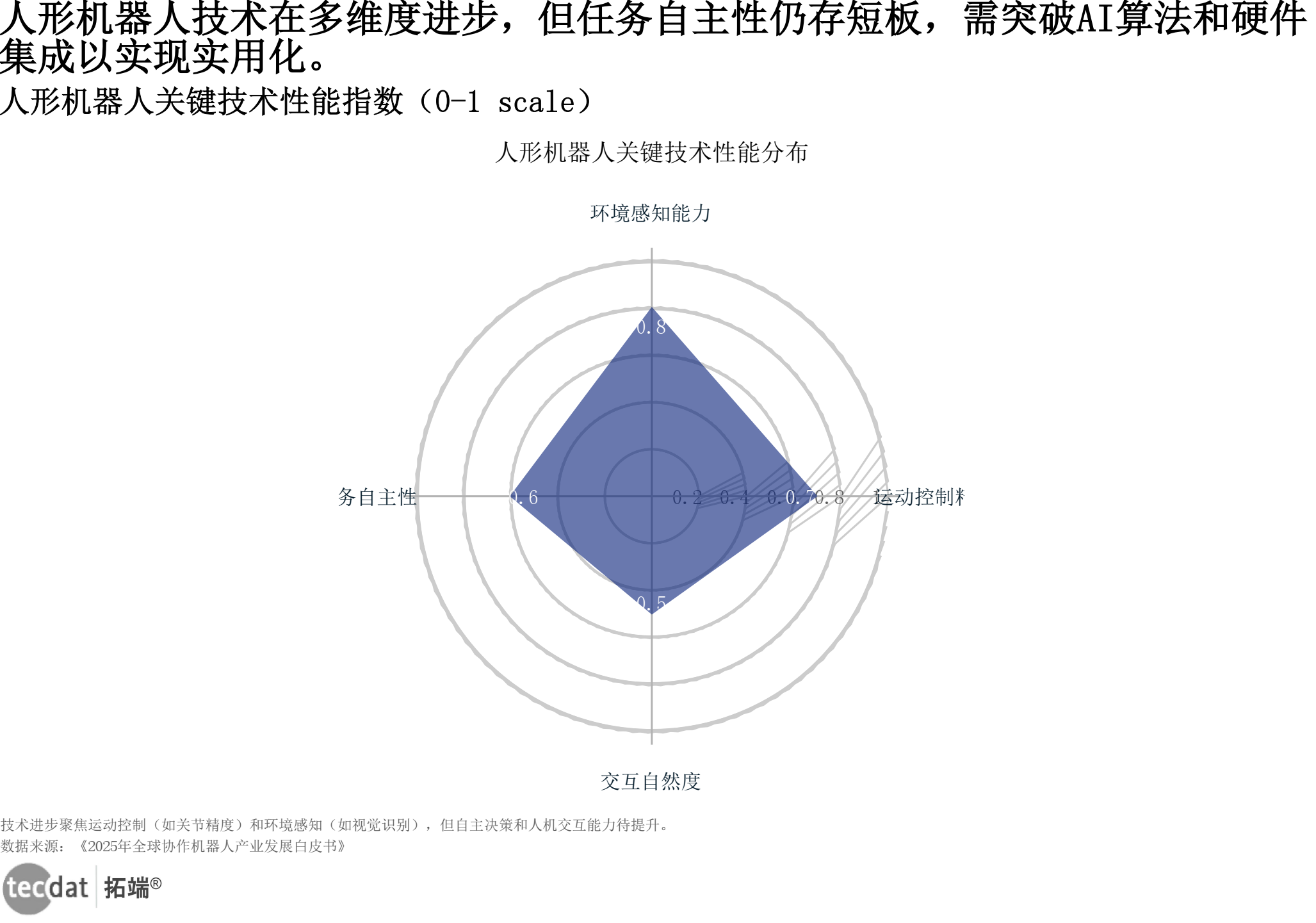 三、技术突破:人形机器人的“能力短板” 从实验室走向工厂,人形机器人还在“补学分”——它现在能流畅行走、抓取物品,但面对“突发情况自主决策”“和工人自然沟通”等问题,仍有明显短板,这也是制约其大规模商用的核心瓶颈。下图用0-1分的性能指数,拆解了人形机器人的“长板”与“短板”,每个分数都对应具体技术场景:
