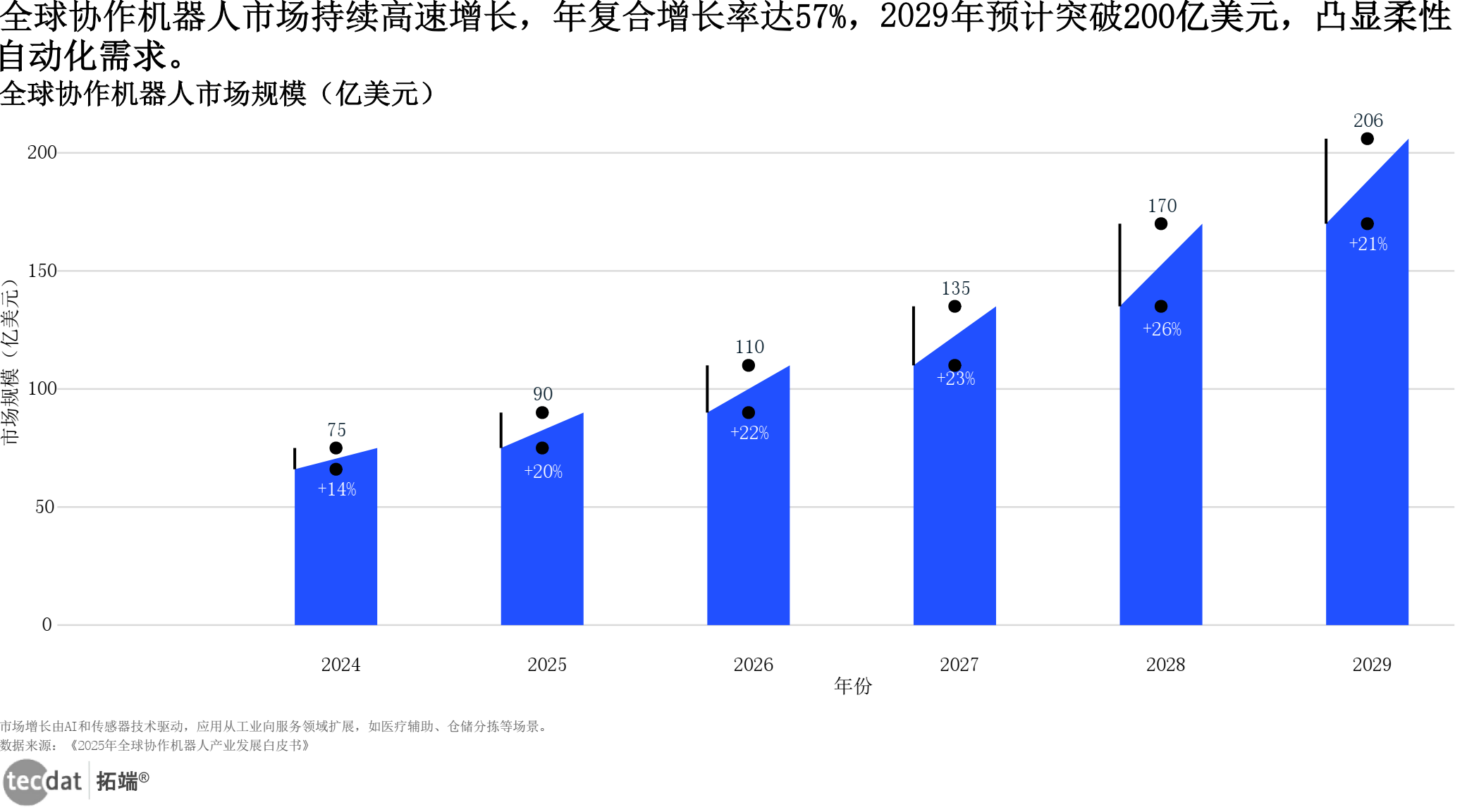 2023年全球协作机器人市场才66亿美元,到2029年预计突破200亿美元,年复合增长率达57%——这个速度是传统工业机器人的3倍。背后逻辑很清晰:一方面,AI算法让机器人“学新任务”的时间从weeks缩至hours(比如从组装手机壳切换到分拣生鲜,仅需2小时调试);另一方面,传感器成本下降让中小企业也能负担——2024年协作机器人单价较2020年降40%,某浙江小家电厂用15万元买2台协作机器人,6个月就收回成本。3秒解读:协作机器人6年增长超3倍,2027年(135亿美元)是规模化落地关键节点。对应人群行动建议:电商仓储负责人可盯紧2025年后的成本窗口——届时单价或再降30%,适合批量引入分拣岗位(如京东亚洲一号仓已用500台协作机器人,分拣效率提升50%);创业者可聚焦“细分场景方案”,比如针对生鲜仓库的“防碰撞+防水”协作机器人,这类垂直方案的溢价比通用款高20%-30%。想获取《2025年全球协作机器人产业发展白皮书》中“场景渗透率”数据的,进群可领取报告节选,里面有3C、食品、医疗三大领域的年度增长预测及头部企业案例。