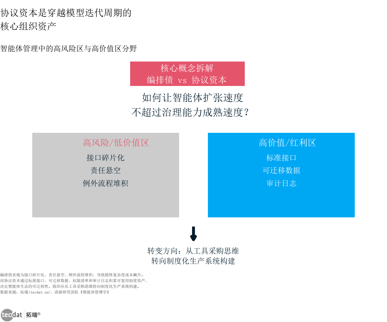 以下图表清晰呈现了报告的核心框架——智能体管理学的底层逻辑是从模型能力转向行动资产与流程单元: