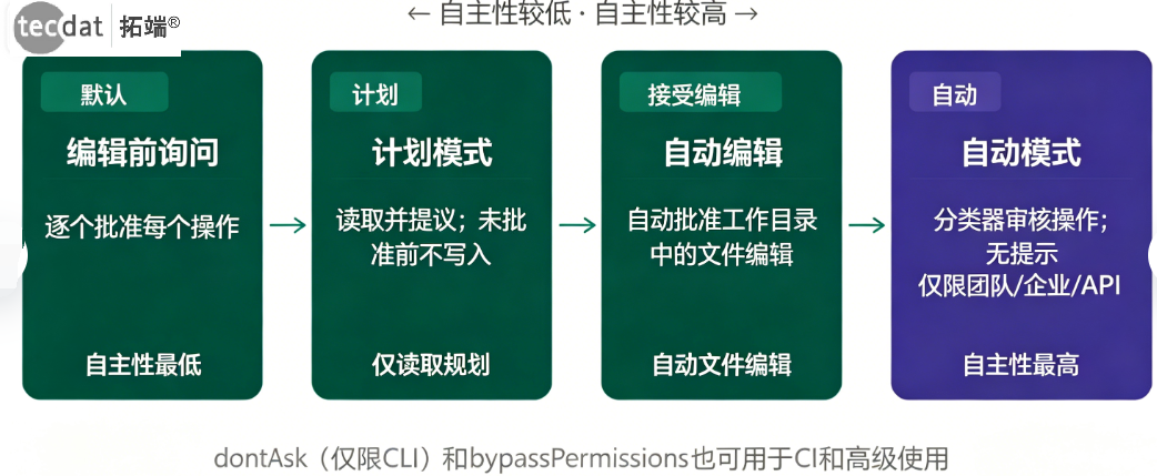 Claude Code的权限管理是其区别于传统AI工具的核心特性。以下是五种权限模式的详细解读:解读:权限模式就像是给智能体设定的“行动自由度”。想象你雇了一个助理:default模式是“每做一件事都来问你能不能做”;plan模式是“先写个方案给你看,批准了再动手”;acceptEdits是“改文件可以自己决定,但运行命令还是要问你”;auto模式是“AI自己判断什么能做,拿不准的再问你”;bypassPermissions相当于“完全放手,出了事再说”。