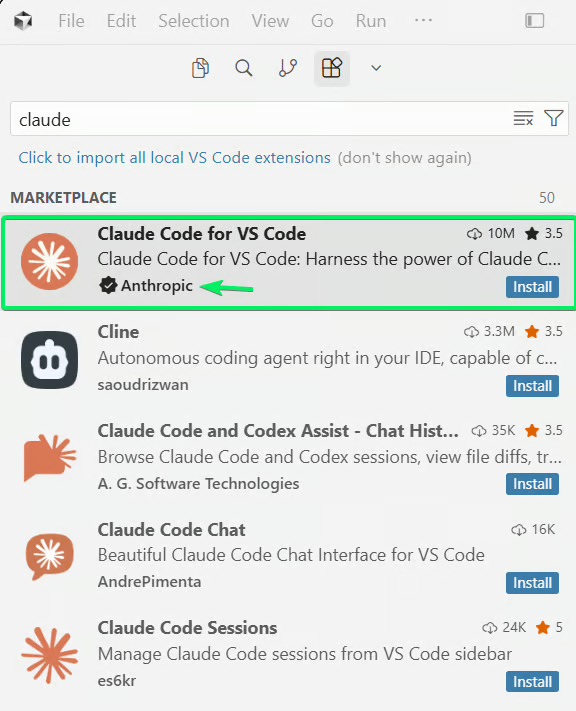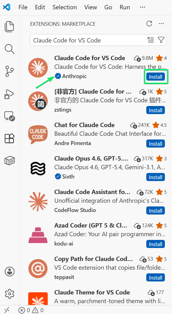 VS Code环境配置:打开扩展面板(Mac:Cmd+Shift+X,Windows/Linux:Ctrl+Shift+X),搜索”Claude Code”并安装Anthropic官方发布的扩展。若搜索结果中未显示,可通过Anthropic文档页面的”Install for VS Code”按钮触发直接安装URI。