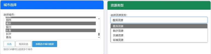 社会资源分析页面(城市与资源类型选择):