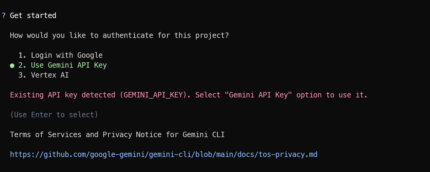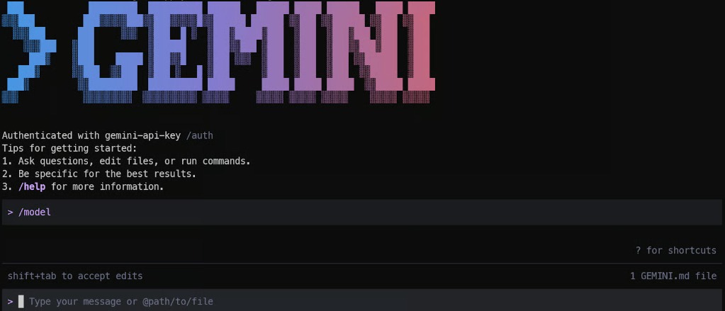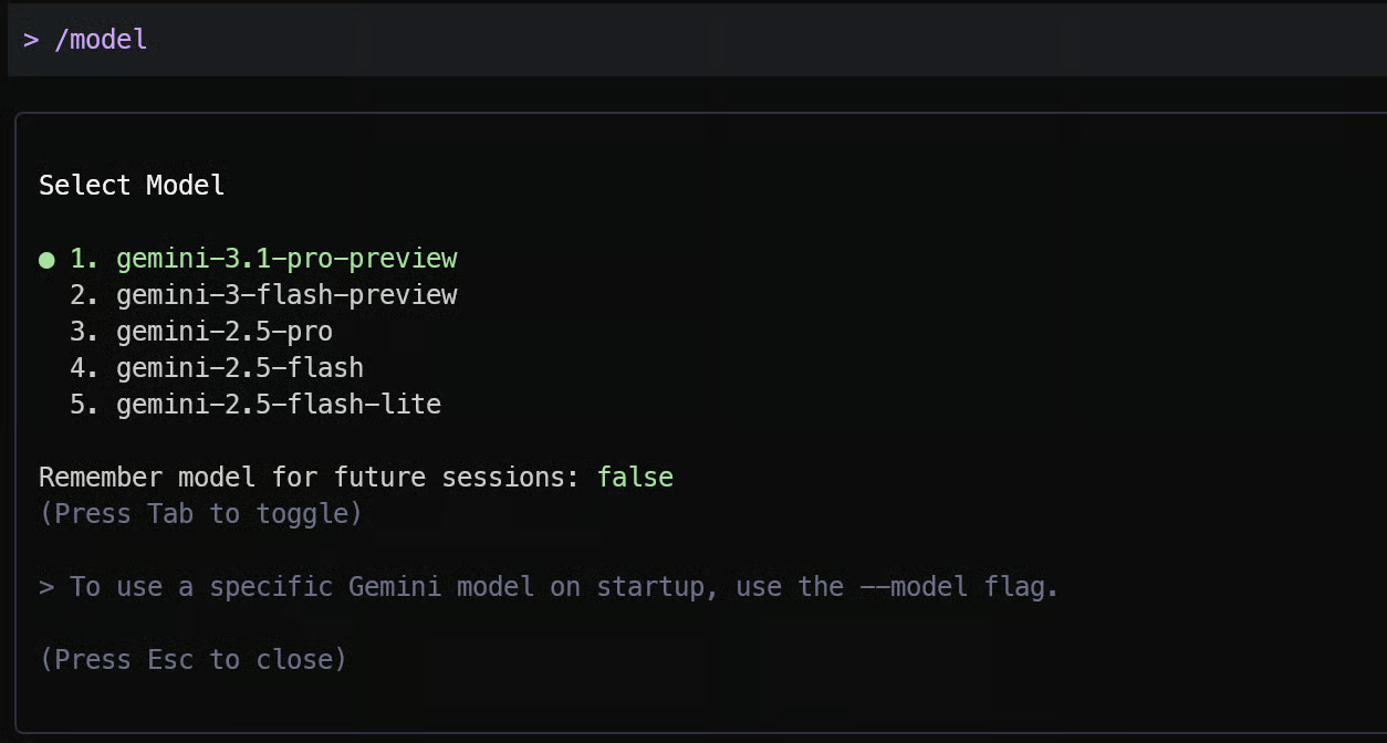 然后启动Gemini CLI:首次启动时,需要使用谷歌账号或API密钥进行身份验证。验证完成后,在Gemini CLI中输入“/model”,选择手动模式,然后从列表中选择最新的Gemini 3.1 Pro预览模型。