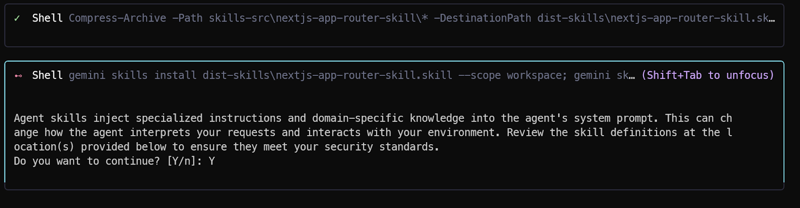 提交指令后,Gemini CLI会先分析项目结构,并建议激活相应的自定义技能。确认激活技能后,它会按照执行规则逐步生成代码。如果想加快流程,可以按CTRL + Y切换到YOLO模式,跳过确认提示。