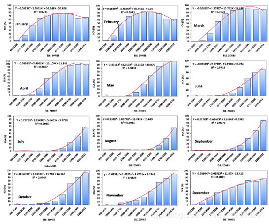 不同海拔范围内的月平均Sca%(2001-2014)和Sca与海拔的关系