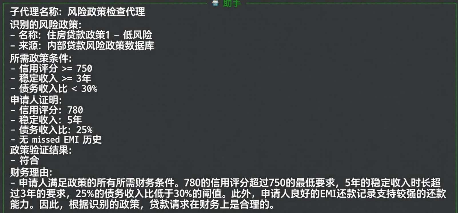 风险政策核对智能体输出:识别出A101匹配“低风险”住房贷款政策,所有条件均满足。