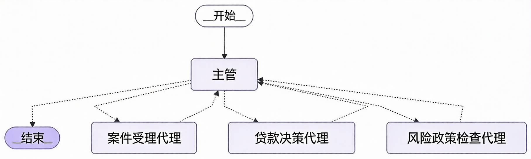 监督者模式正是为了解决这一痛点而诞生。它不再是一个任务执行者,而是一个组织者,负责协调多个专用智能体完成复杂任务。其核心职责包括:任务分解与分派、流程编排、质量控制、结果整合。这种设计带来的好处是显而易见的:每个智能体只需关注单一职责,逻辑简单且性能稳定;整个系统易于调试、扩展和维护。下文我们将通过一个具体的信贷审批自动化案例,手把手搭建这样一个“AI团队”。